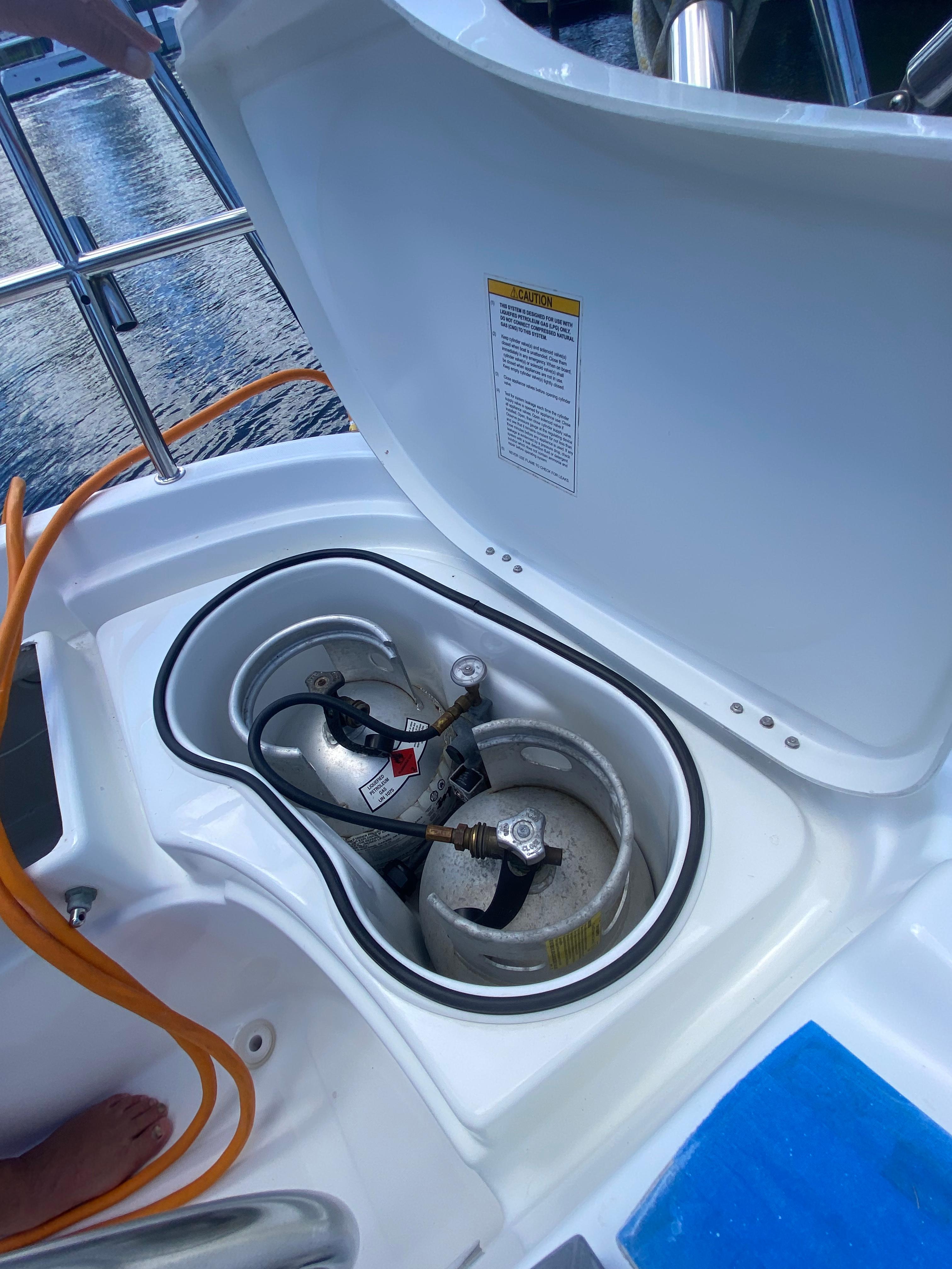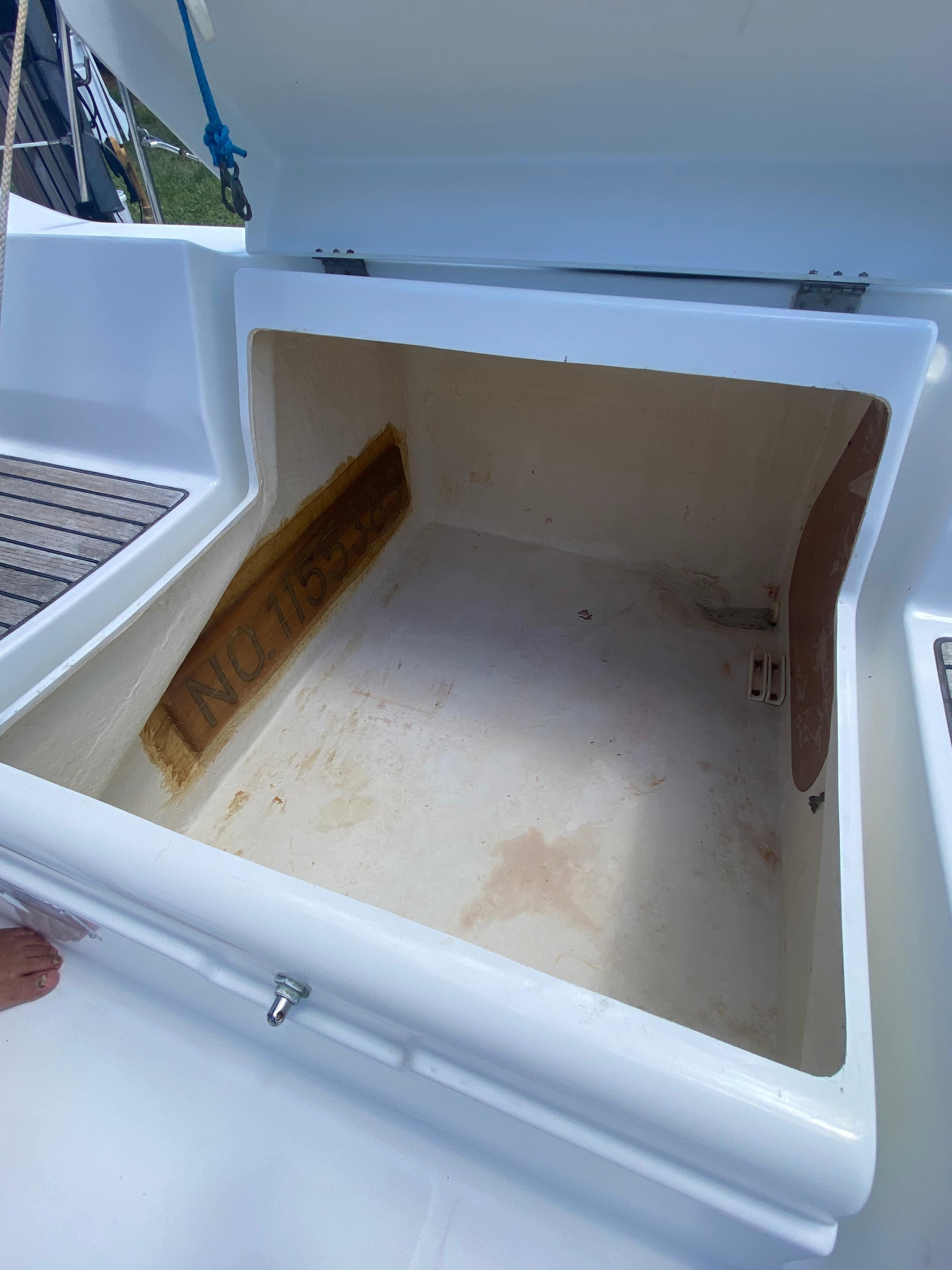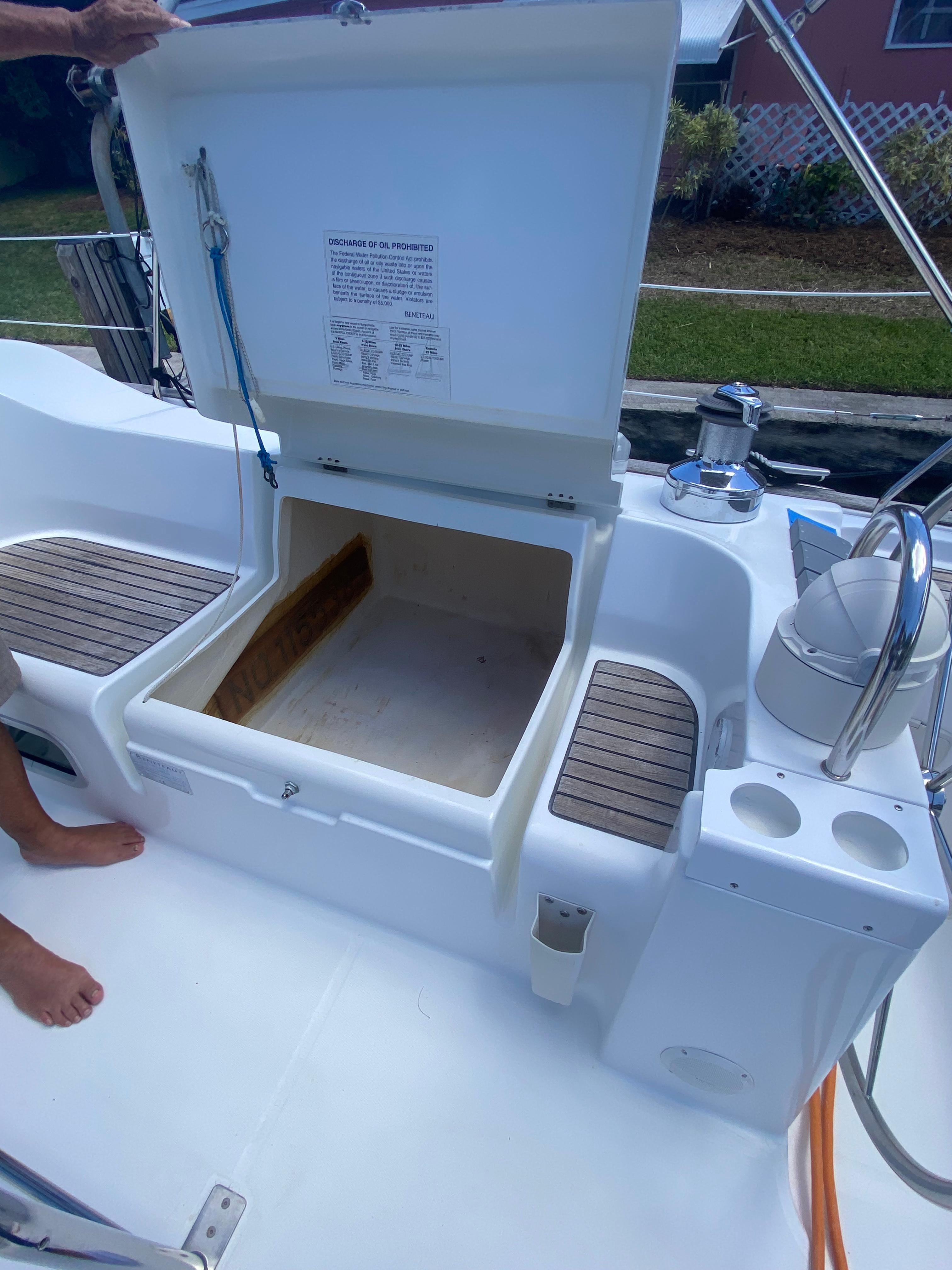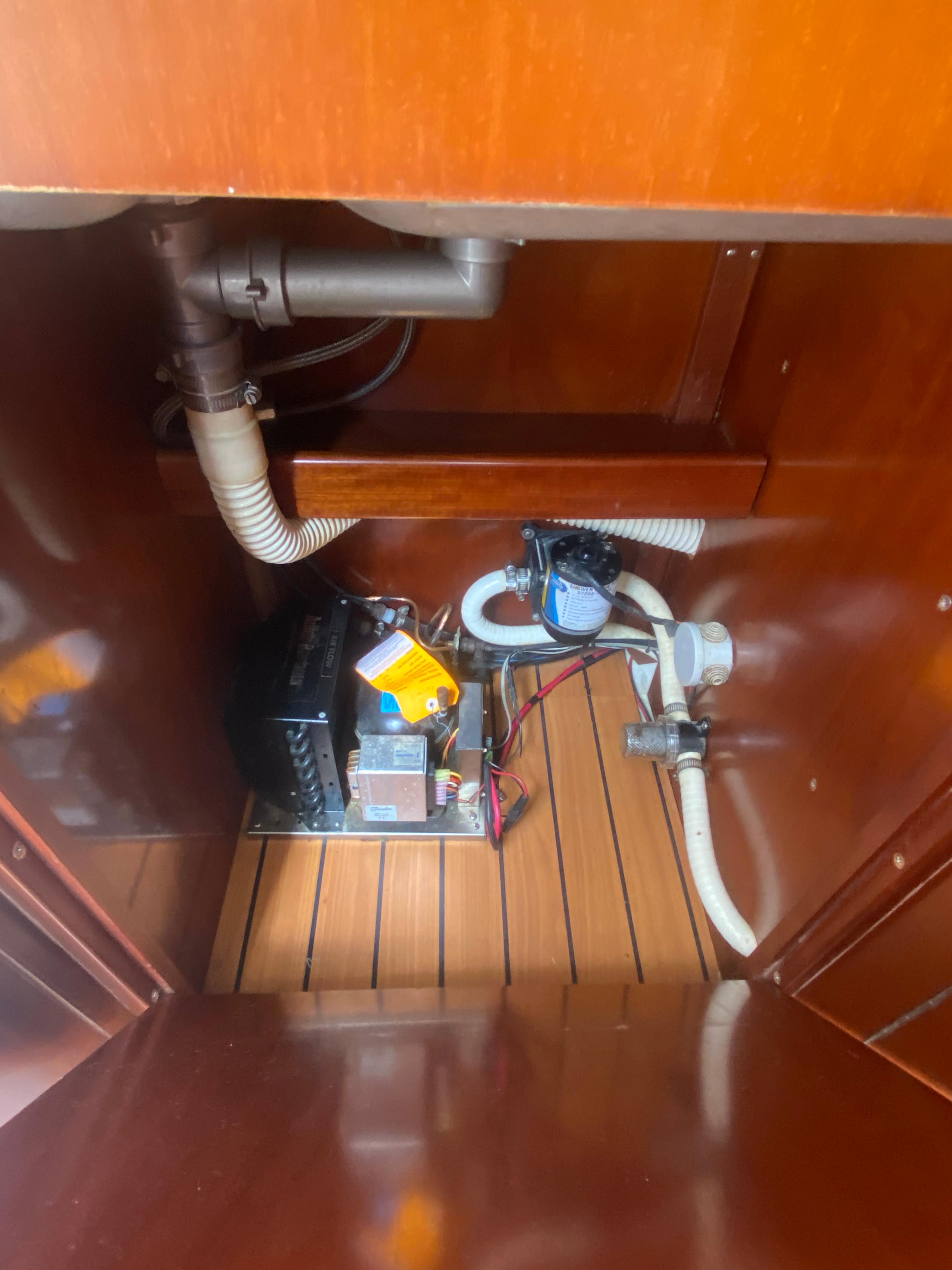The Salon, Galley and Nav Station share an open area with the Staterooms fore and aft. Heads are forward starboard and aft to port, both with showers. Finish is cherry wood and the sole is teak and holly. Staterooms aft are large and well-lit. The āVā berth is large and has storage under it. Engine access is under the companionway steps and on either side in the aft staterooms.