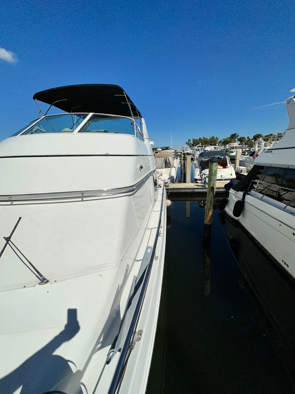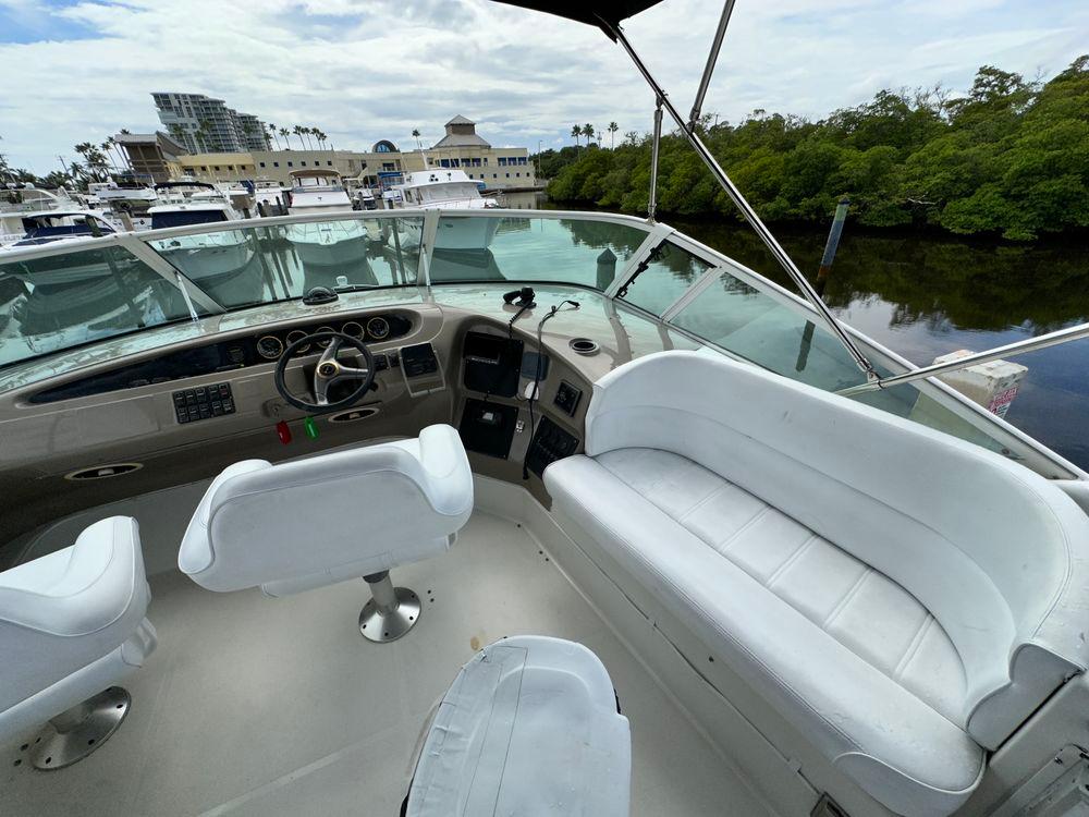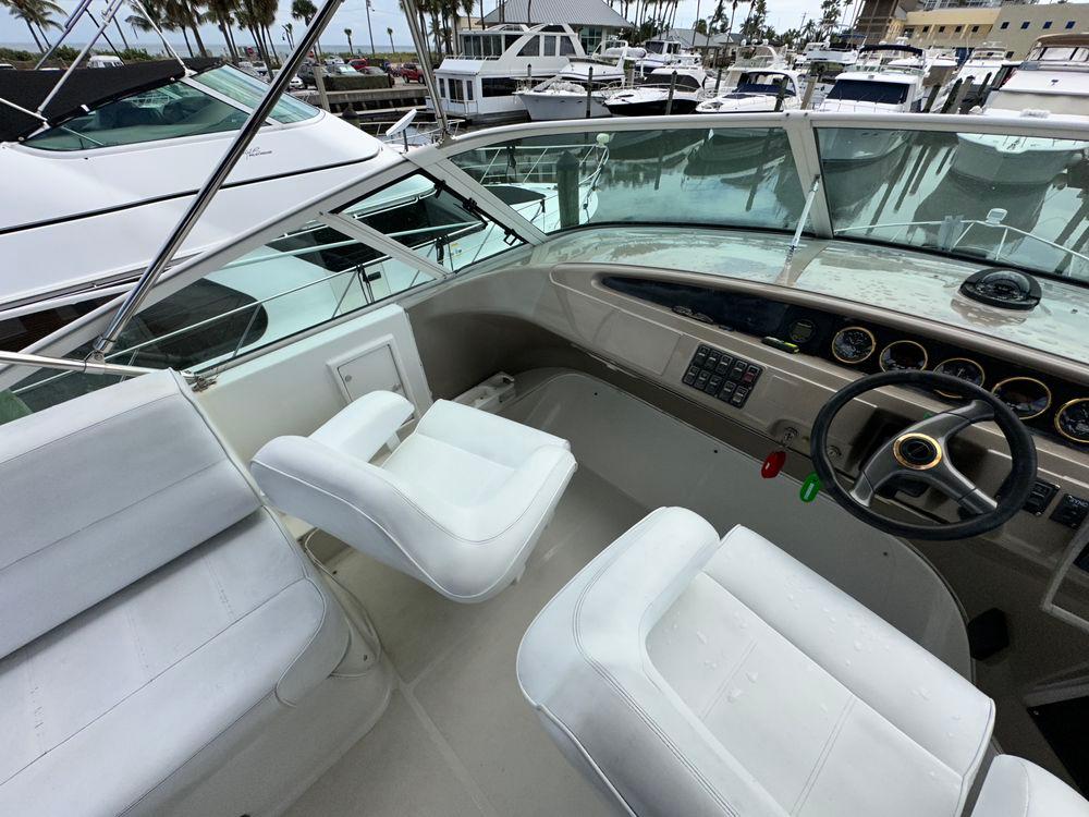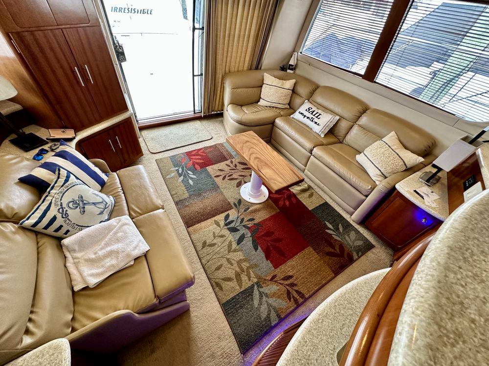 The Carver 450 Voyager Pilothouse has two very large and spacious double cabins below, both with ensuite heads. The saloon features plenty of seating and huge side windows which allows the natural light to brighten the whole area. Facing the bow and to starboard, is a clever raised pilothouse with dining table and seating area. The galley layout is longitudinal and on the portside.