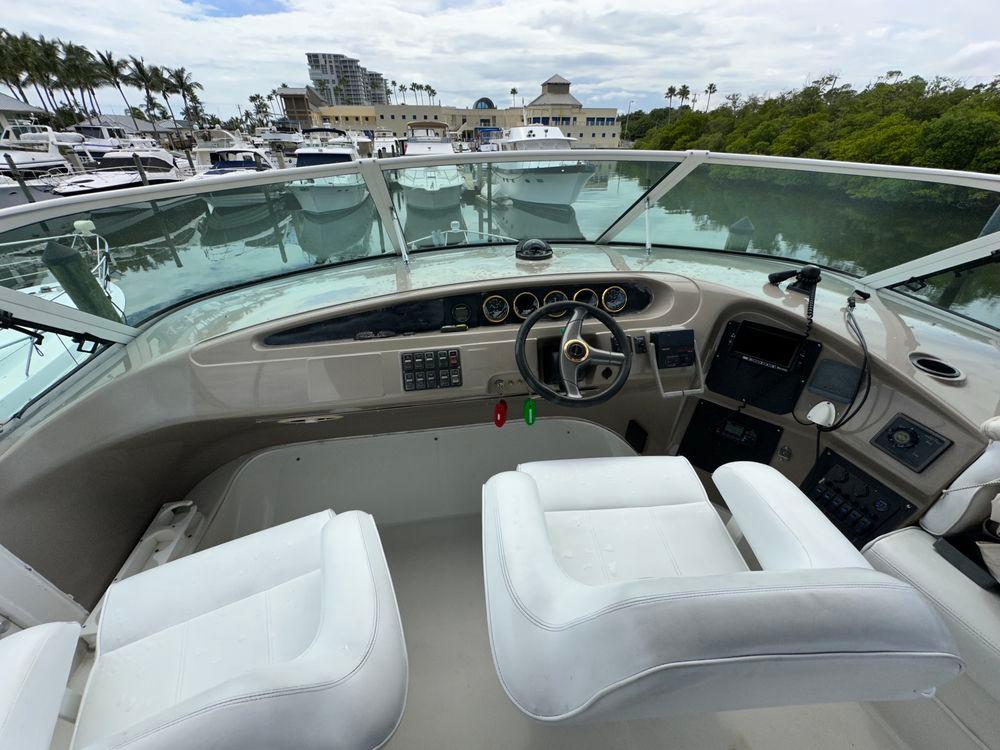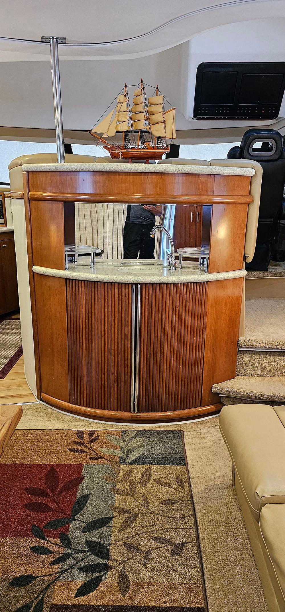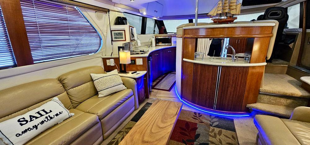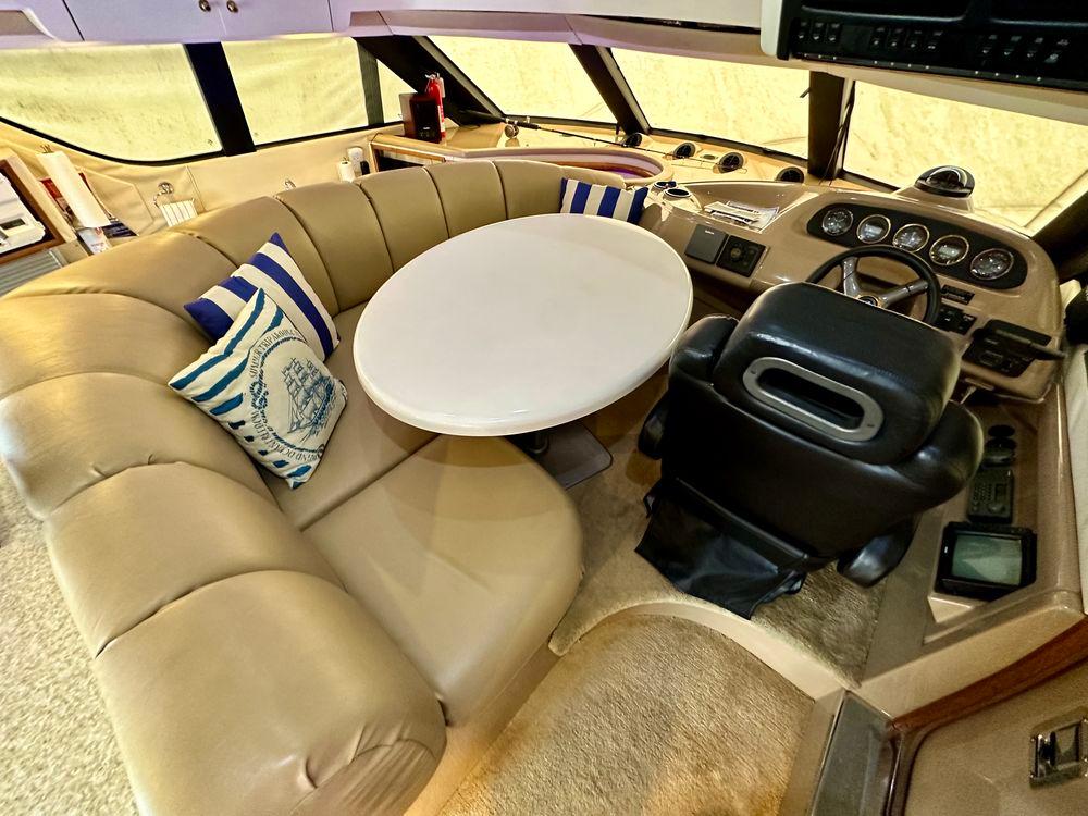 The Carver 450 Voyager Pilothouse has two very large and spacious double cabins below, both with ensuite heads. The saloon features plenty of seating and huge side windows which allows the natural light to brighten the whole area. Facing the bow and to starboard, is a clever raised pilothouse with dining table and seating area. The galley layout is longitudinal and on the portside.