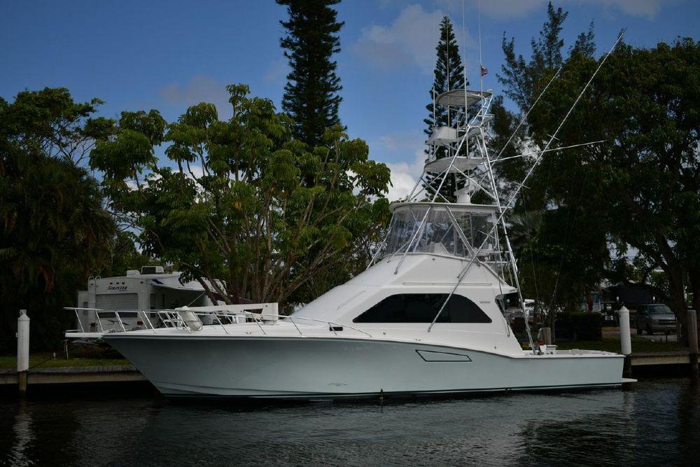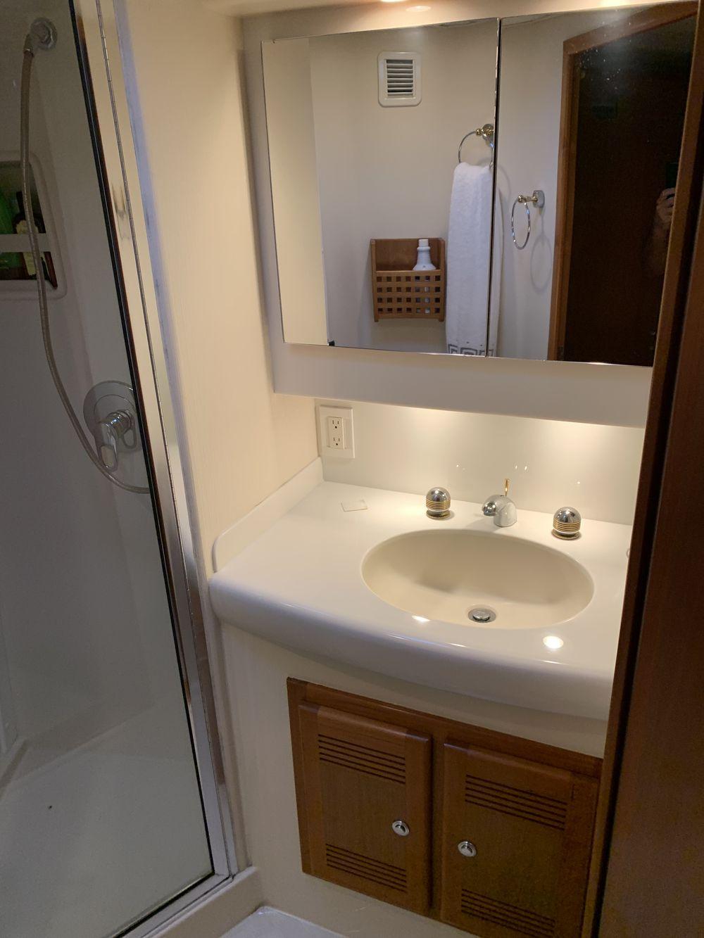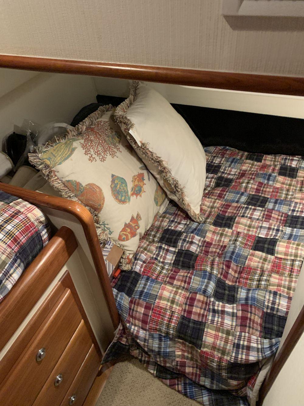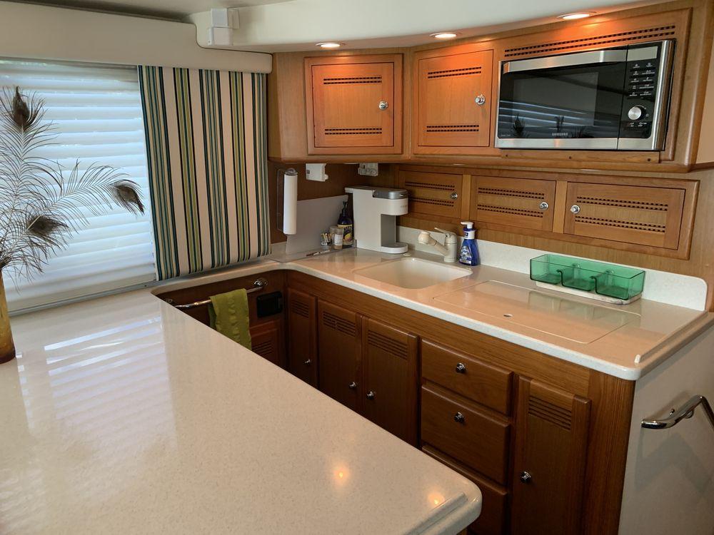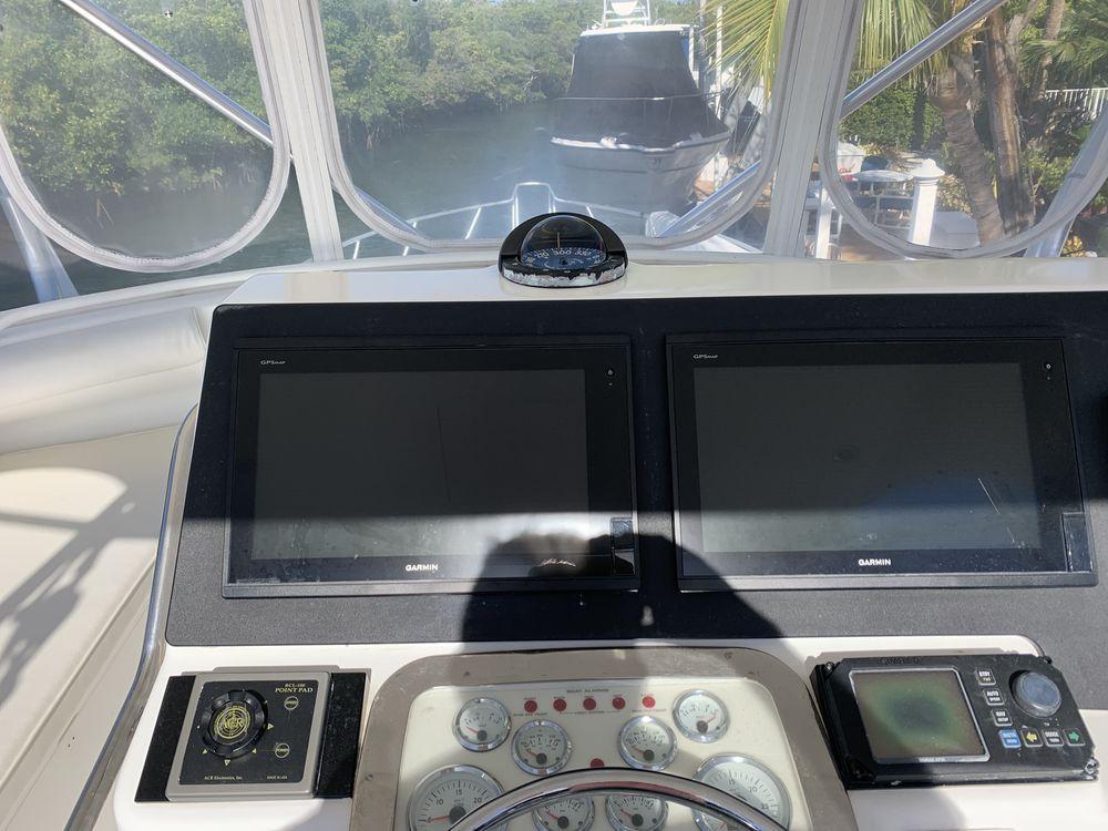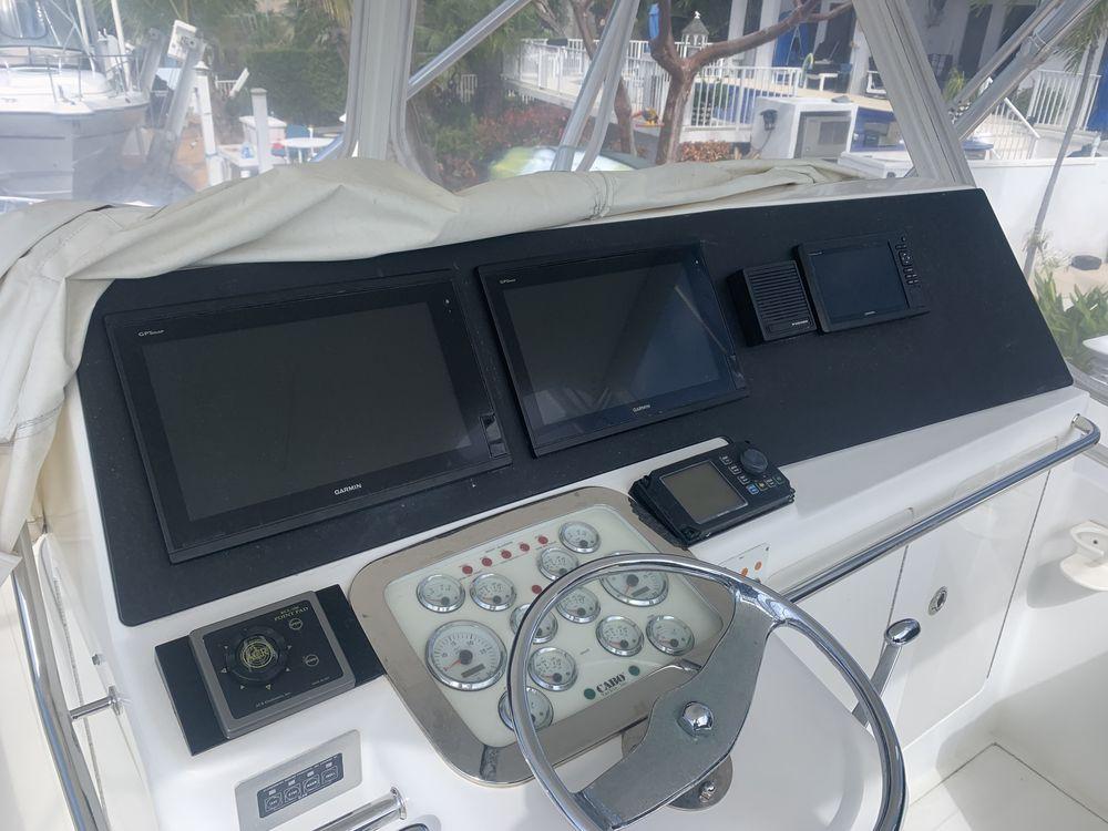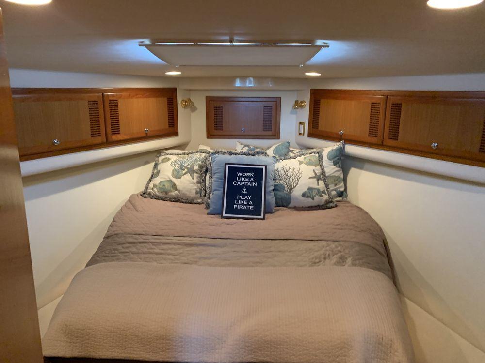 The Master Stateroom features a walk around Queen berth forward with storage drawers below and hanging lockers. Two full heads with separate stall showers both on port side. One opens to the master cabin and one opens to the companionway. The guest cabin is uniquely arranged with upper and lower berths on the starboard side and a full berth mid-cabin. The washer/dryer combo is tucked away in the companionway. The salon features the galley up with Corian countertops and Sub-Zero refrigerator/freezer drawers. The dinette and entertainment center is to starboard. There is an L-shaped settee with rod storage and the electrical panel and icemaker is to starboard. Full tackle center freezer and engine room access in the cockpit, two in deck fish boxes, fighting chair with rocket launcher and transom live well. Her bridge has a well arranged fully equipped helm with ladder back helm seats.
