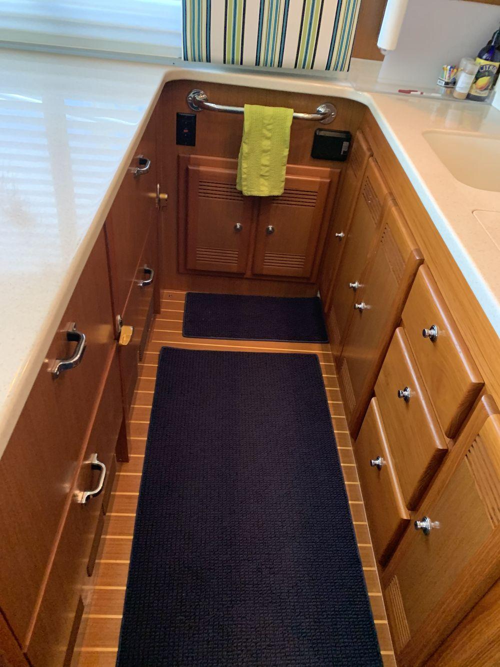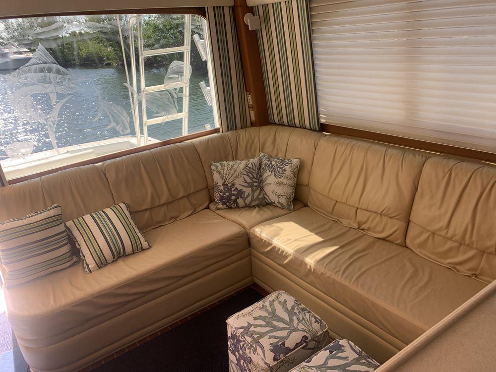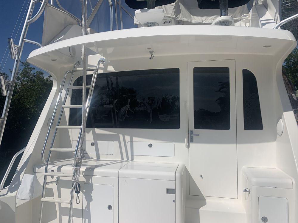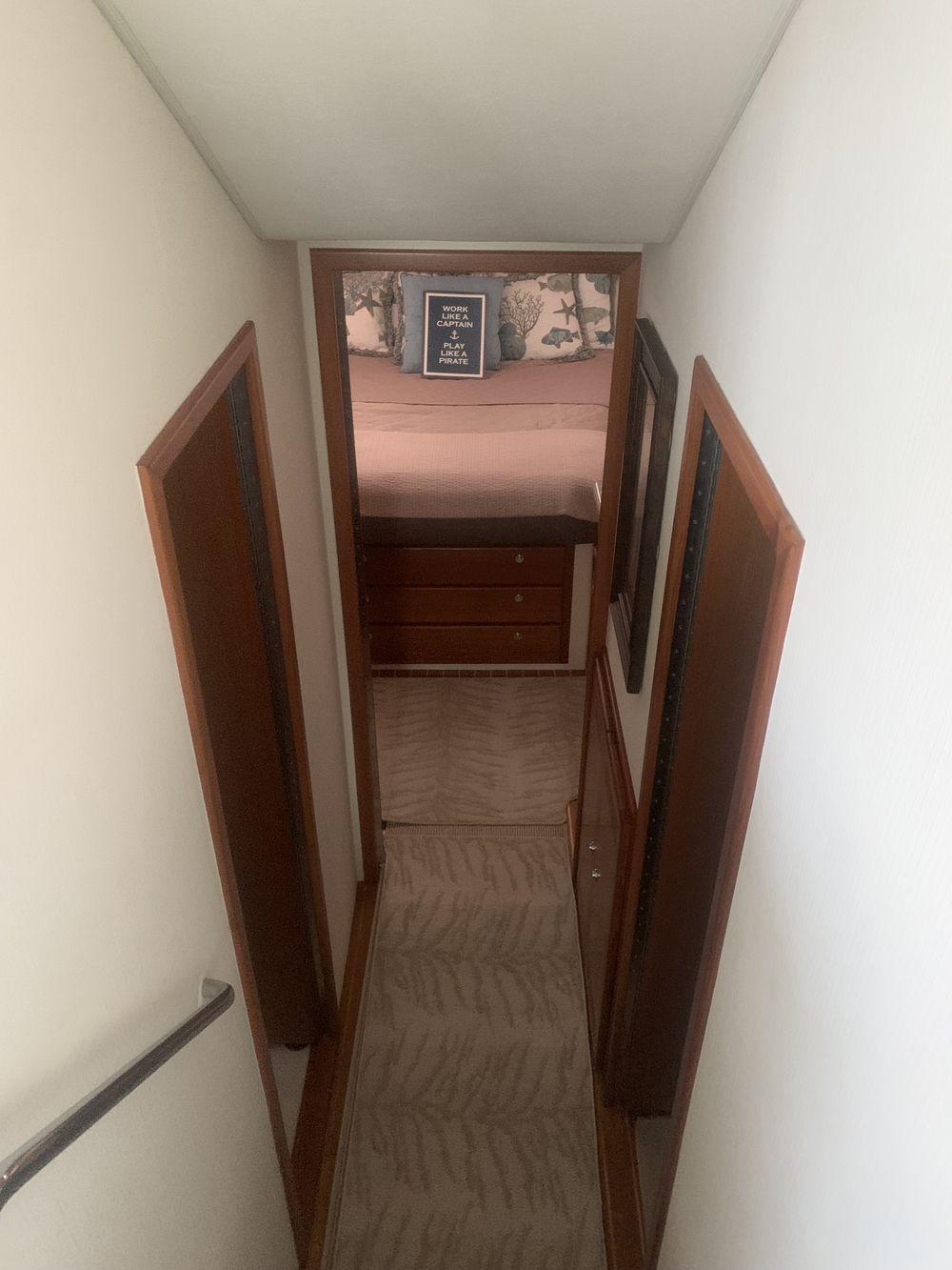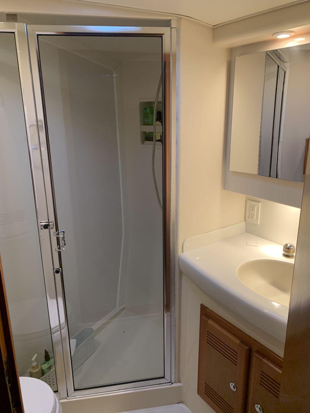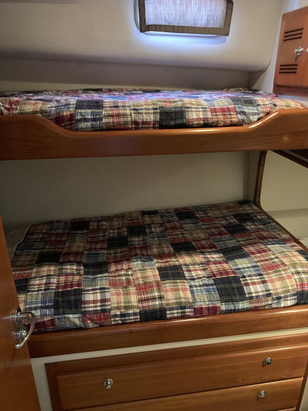The Master Stateroom features a walk around Queen berth forward with storage drawers below and hanging lockers. Two full heads with separate stall showers both on port side. One opens to the master cabin and one opens to the companionway. The guest cabin is uniquely arranged with upper and lower berths on the starboard side and a full berth mid-cabin. The washer/dryer combo is tucked away in the companionway. The salon features the galley up with Corian countertops and Sub-Zero refrigerator/freezer drawers. The dinette and entertainment center is to starboard. There is an L-shaped settee with rod storage and the electrical panel and icemaker is to starboard. Full tackle center freezer and engine room access in the cockpit, two in deck fish boxes, fighting chair with rocket launcher and transom live well. Her bridge has a well arranged fully equipped helm with ladder back helm seats.