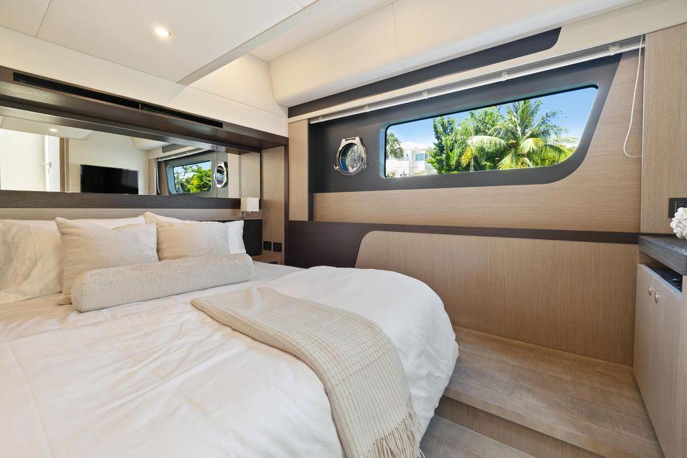 In the salon, the large side windows envelop the entire deck and, together with the panoramic windshield, offer uninterrupted