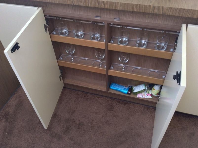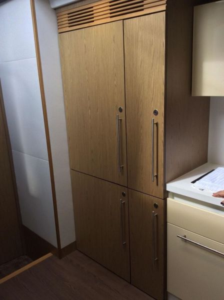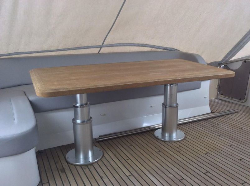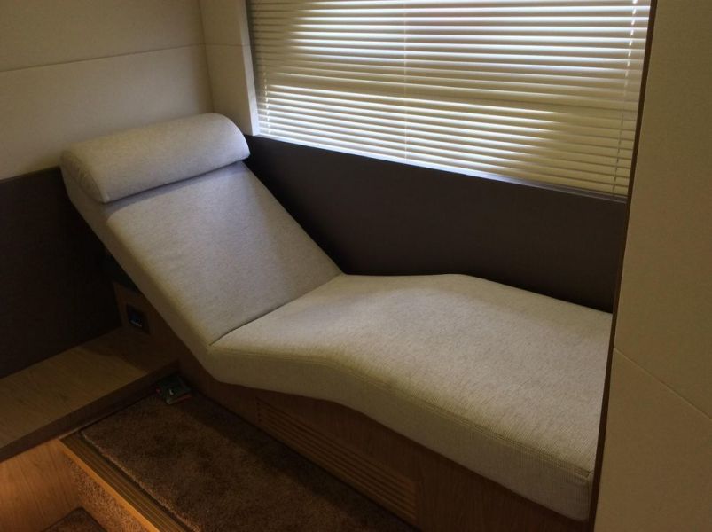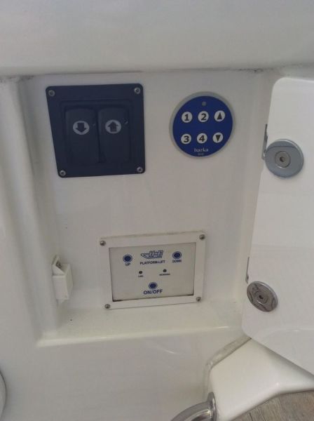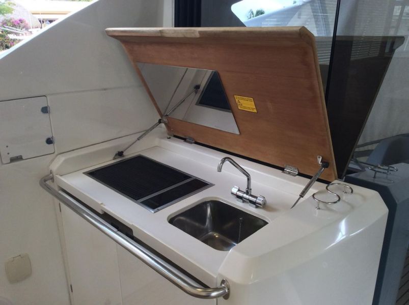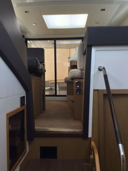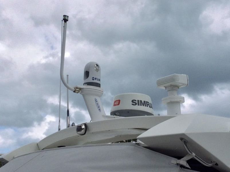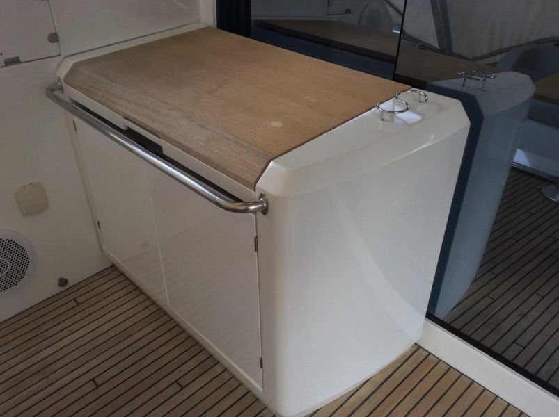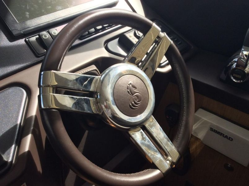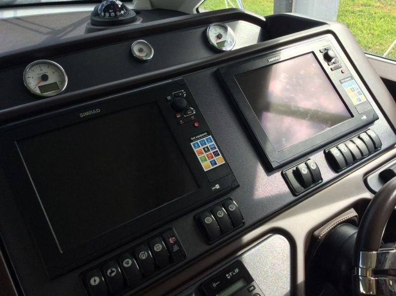 The helm is outfitted with IPS Volvo Controls, Twin Simrad Touchscreen Navigation, and FLIR Night Vision. The Aft Deck seating area has a beautiful teak table, a BBQ grill and an outdoor fridge for cold drinks. Finally, there is a Hydraulic Swim-Platform and a Tender Garage.