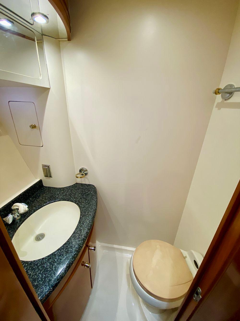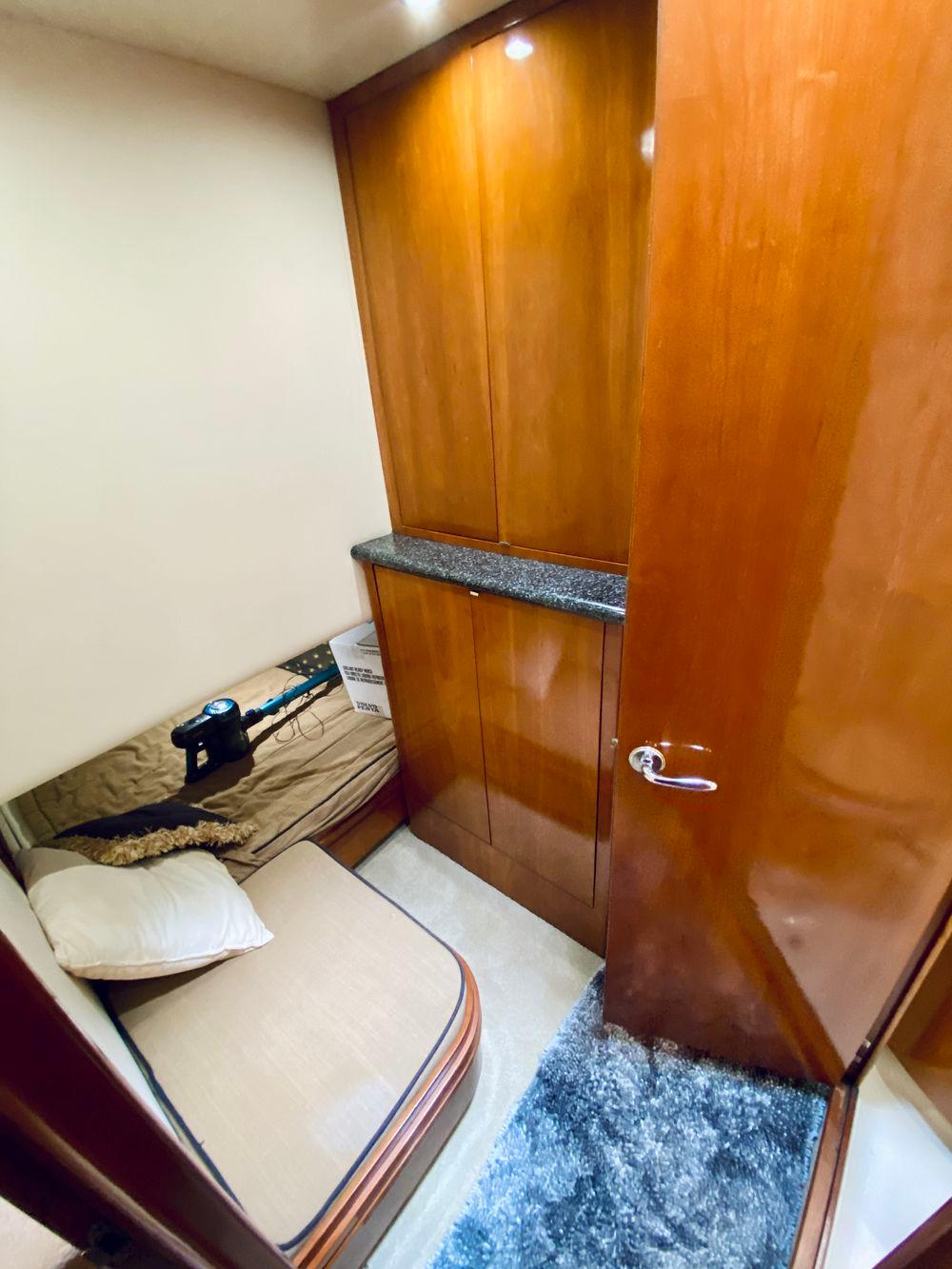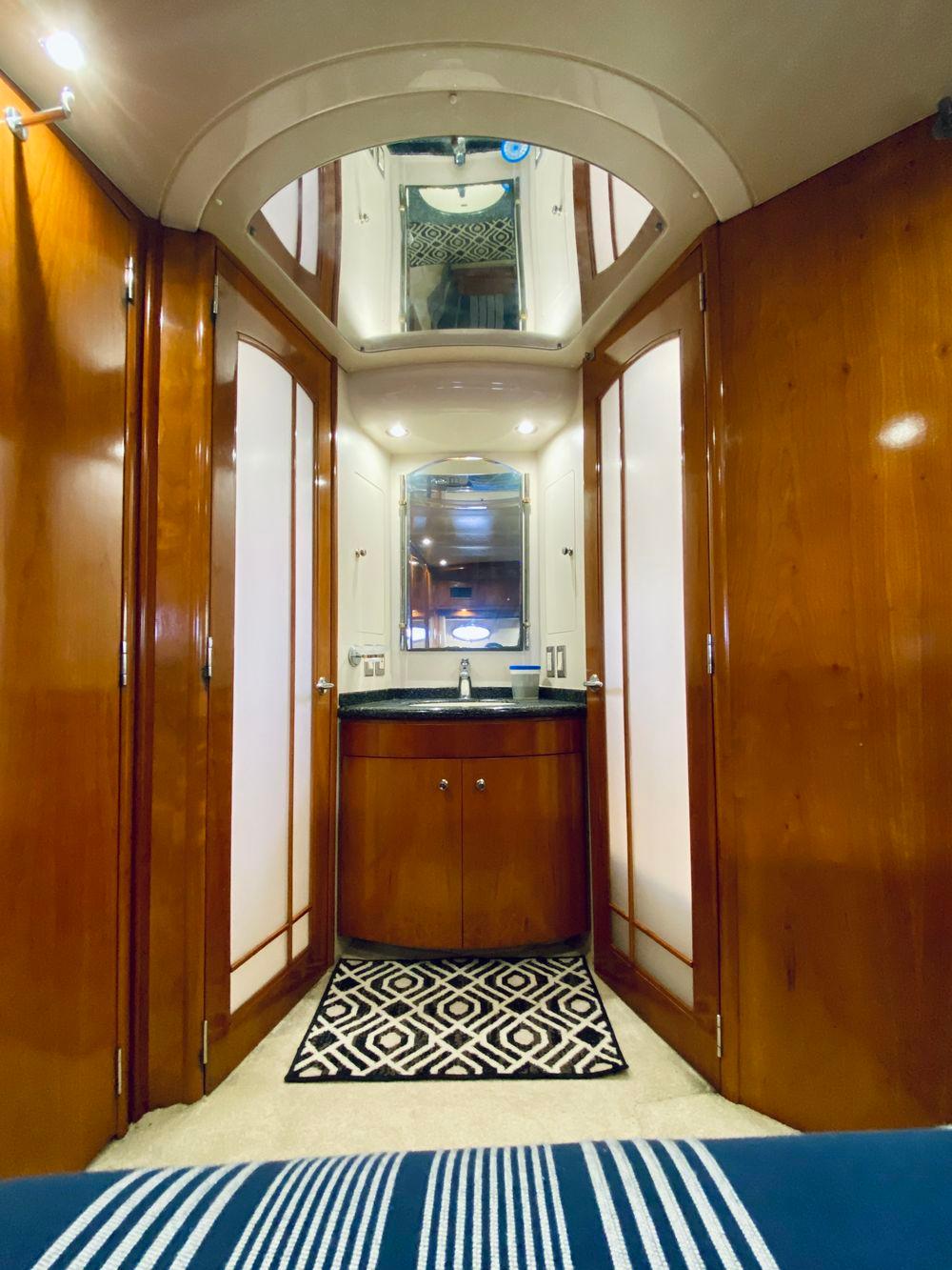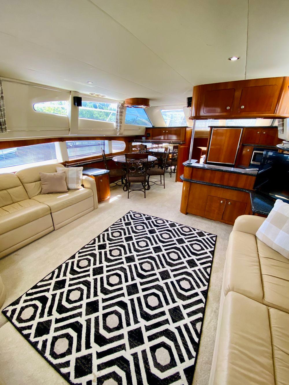 The Carver 506 Motor Yacht is the most outstanding example of Carver's raised gunnel design. First seen on Carver's 350 Mariner, this unique design combines the spaciousness and accommodations of the traditional aft cabin with the sleek, contemporary styling of an express cruiser. And, added touches like smoother, more contoured edges, graceful curves, nearly flush walkdecks, and elliptical windows create sleeker, more streamlined styling. Topside, the command bridge is available with full hard enclosures, optional air conditioning, and seating for nine. With over 100 square feet of aft deck space, and an optional central island wetbar with an icemaker and refrigerator, owners discover the entertainment potential. Overhead, the 506's unique hardtop structure with built-in retractable sunroof lets in the sun or protects the crew from the rain. Below deck, the Carver 506 Motor Yacht has cherry wood paneling and cabinetry, designer hardware and fixtures, and solid-surface countertops that provide stunning detail to the main cabin. Because the salon, galley, and dinette stretch the full width of the beam, the open-concept living environment is perfect for entertaining friends. Plus, guests standing in the fully equipped, casually sunken galley, or seated in the salon, can enjoy a perfect line of sight outdoors through the 506's two-tiered window system. The 506 has three full staterooms, each with a private head for added privacy and luxury. The master stateroom aft features incredible amounts of storage, a queen-size, inner-spring island berth, and a private head with separate water closet and shower compartments. Forward, the guest stateroom offers another queen-size island berth, inner-spring mattress, and a large private head. To port, a third stateroom provides a full-size locker, a private head, and a split-berth arrangement.