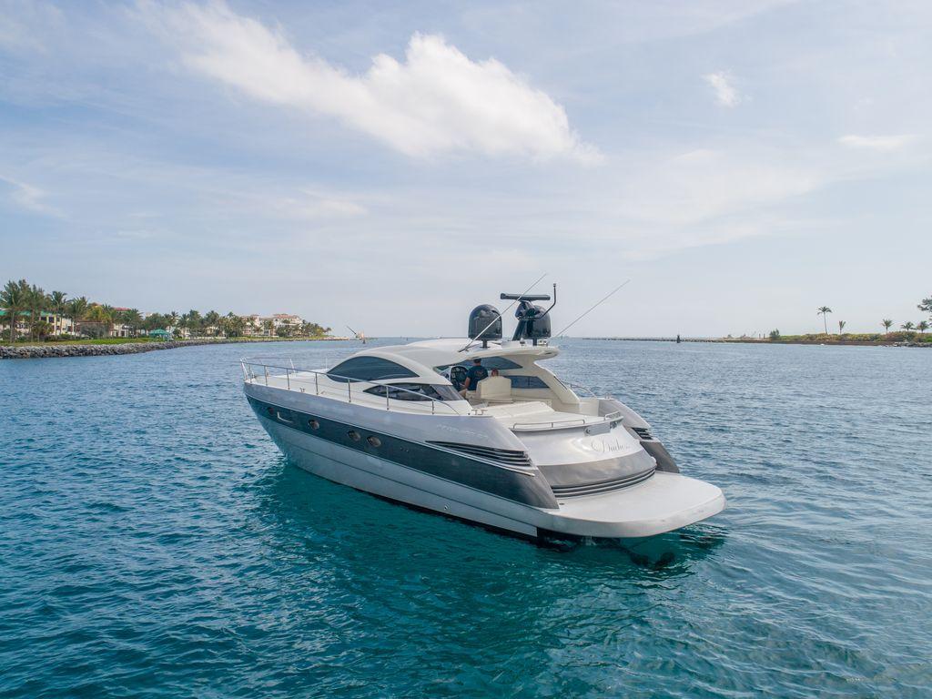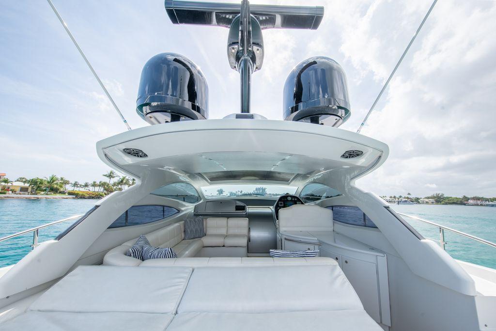 Comfortable size helm deck allows easy handling of docking lines and access into the salon. The large seating/sunpad area is aft on the centerline w/ 8 man Viking life raft stored below the starboard side deck.