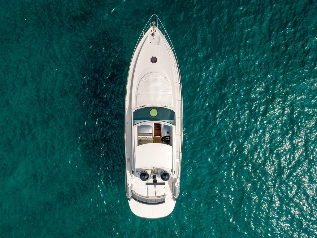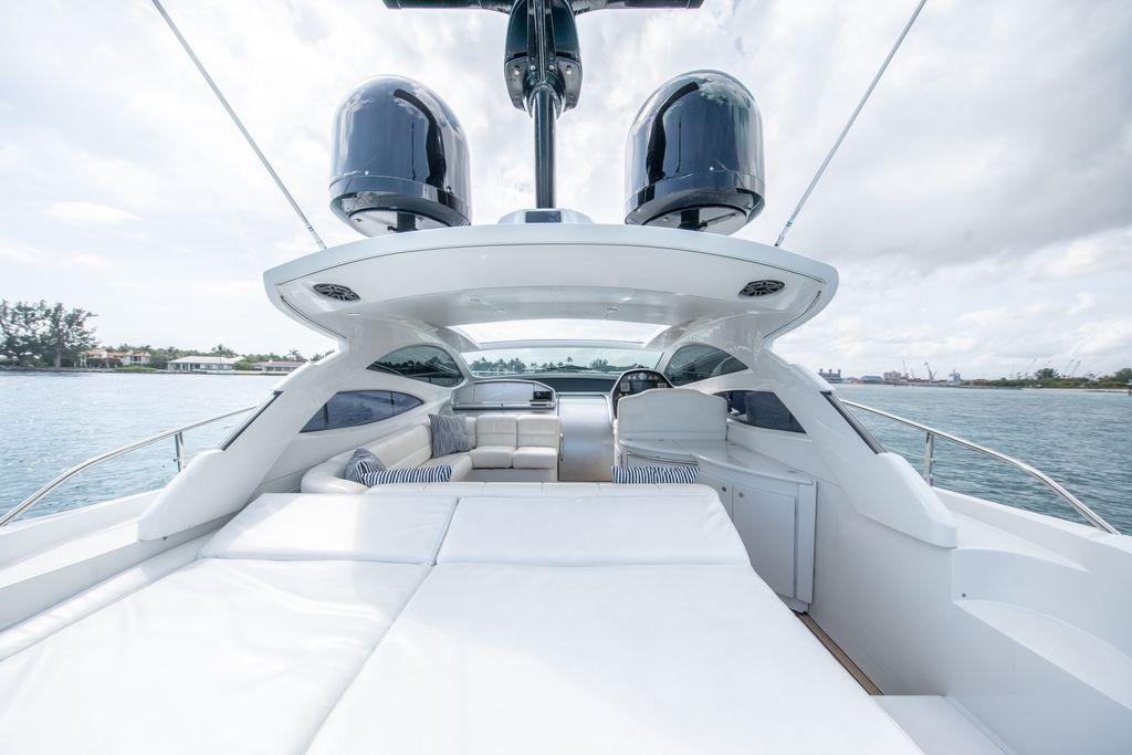 Comfortable size helm deck allows easy handling of docking lines and access into the salon. The large seating/sunpad area is aft on the centerline w/ 8 man Viking life raft stored below the starboard side deck.