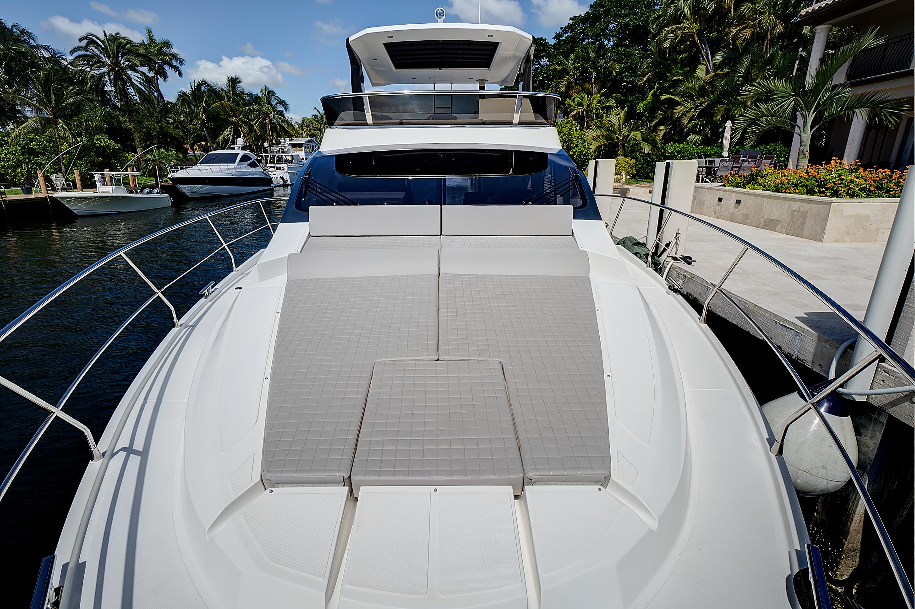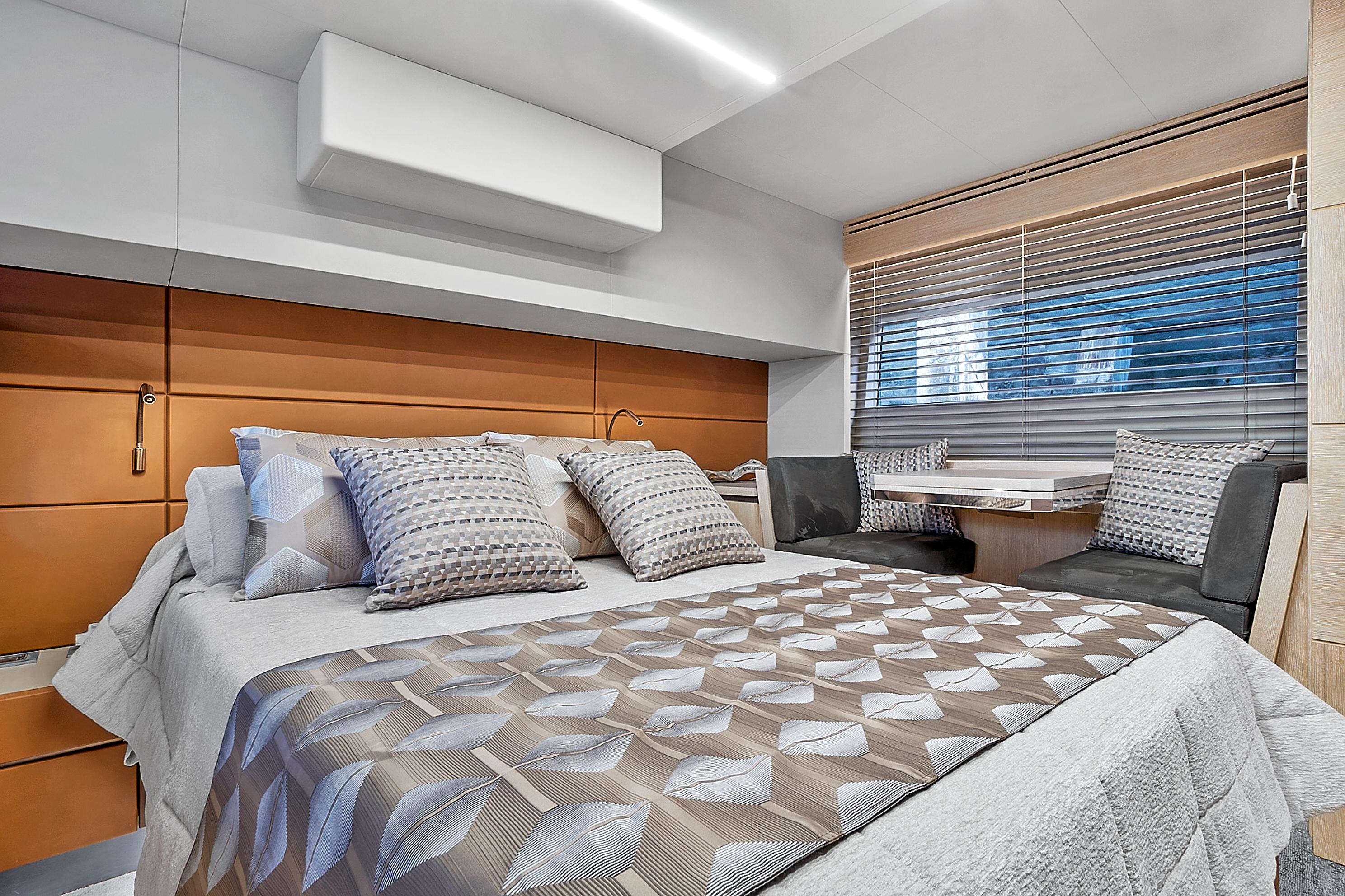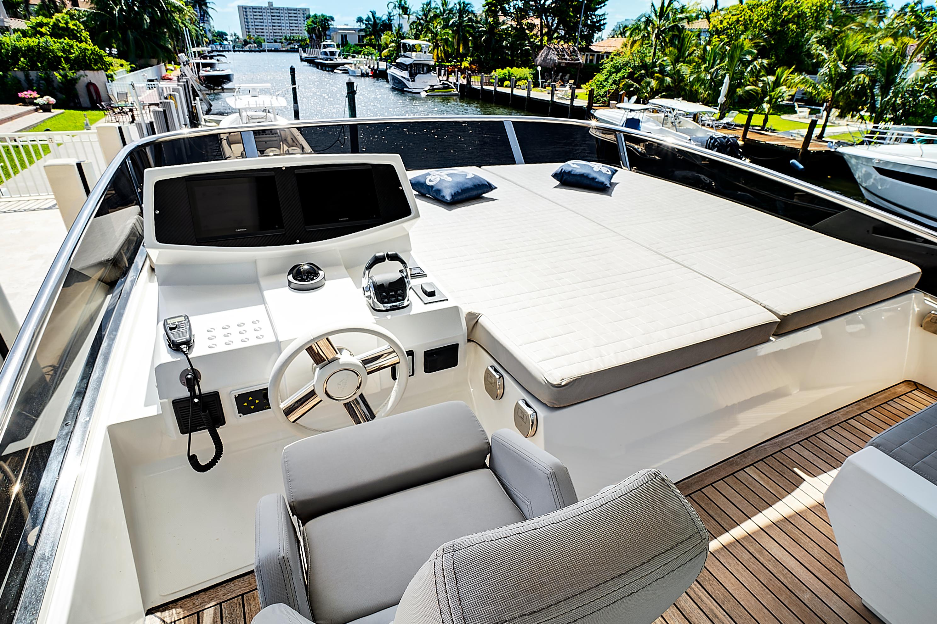 As a sport cruiser, the Astondoa 52 Flybridge feels like a much larger yacht, yet handles with ease, emphasizing the outdoors. The flybridge adds sporty function and style, accommodating a sun pad and L-shaped seating that surrounds the helm station covered by a hardtop that employs a retractable canvas sunroof. A dining table folds to cocktail size, while the wet bar, grill and refrigerator offer more amenities for entertaining. The broad bow sun pad adjoins a Portuguese lounge, providing breezy sunning in cushioned comfort.