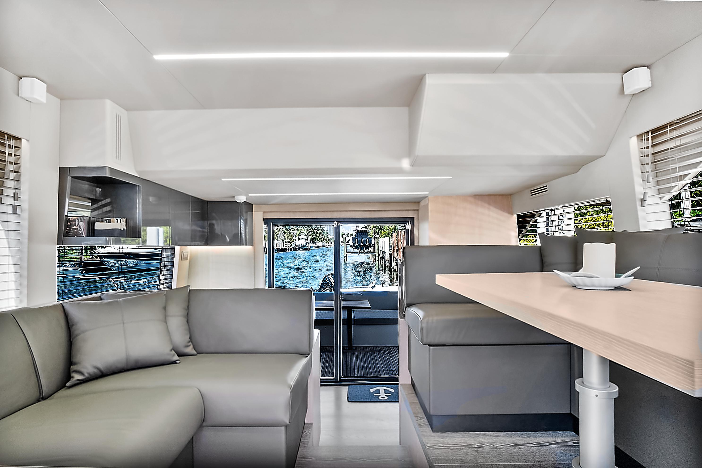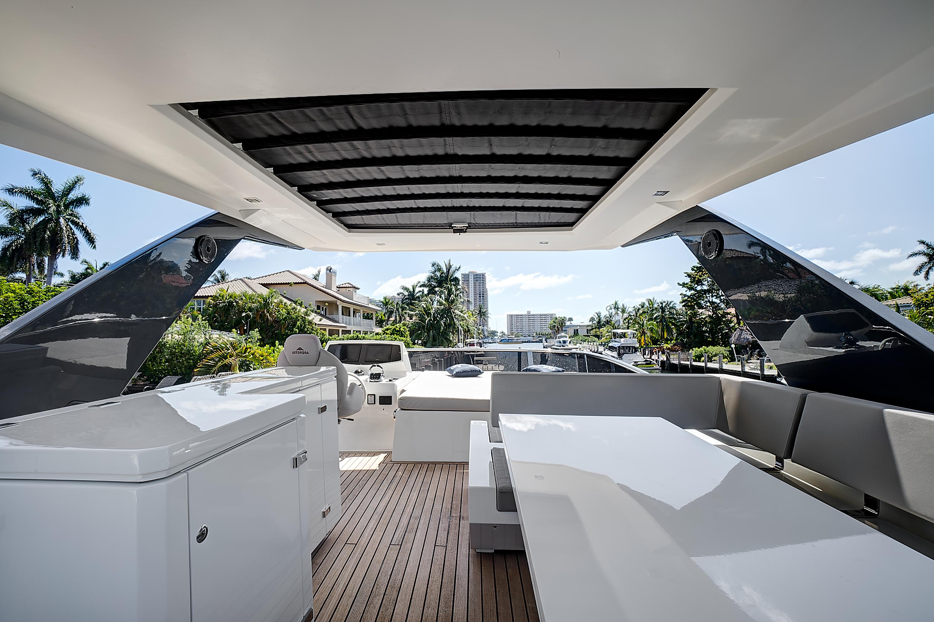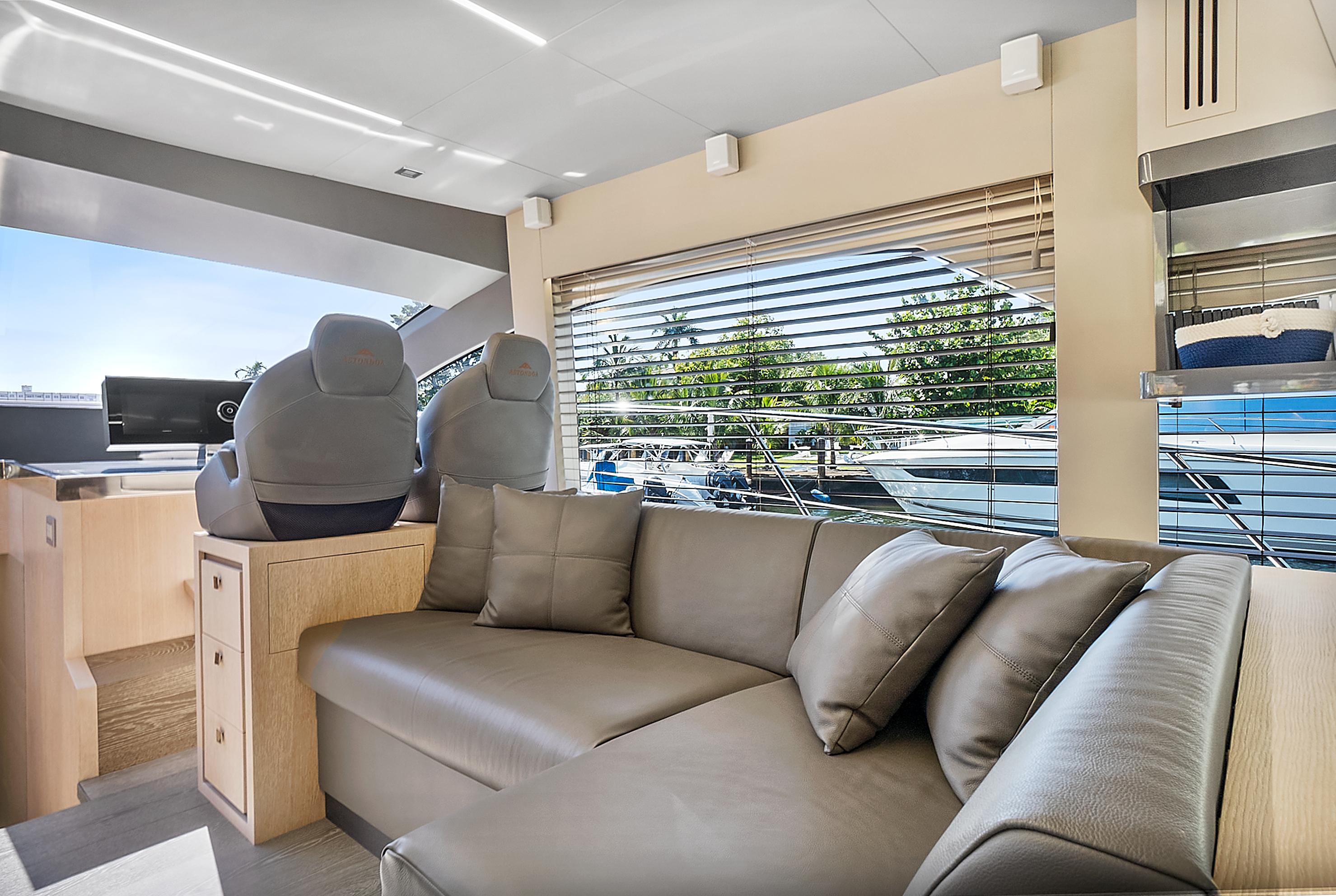Natural light pours into the salon and cabins through large side windows, which add to the sporty, but sleek profile. Performance meets comfort and casual elegance in this Astondoa mid-range yacht.