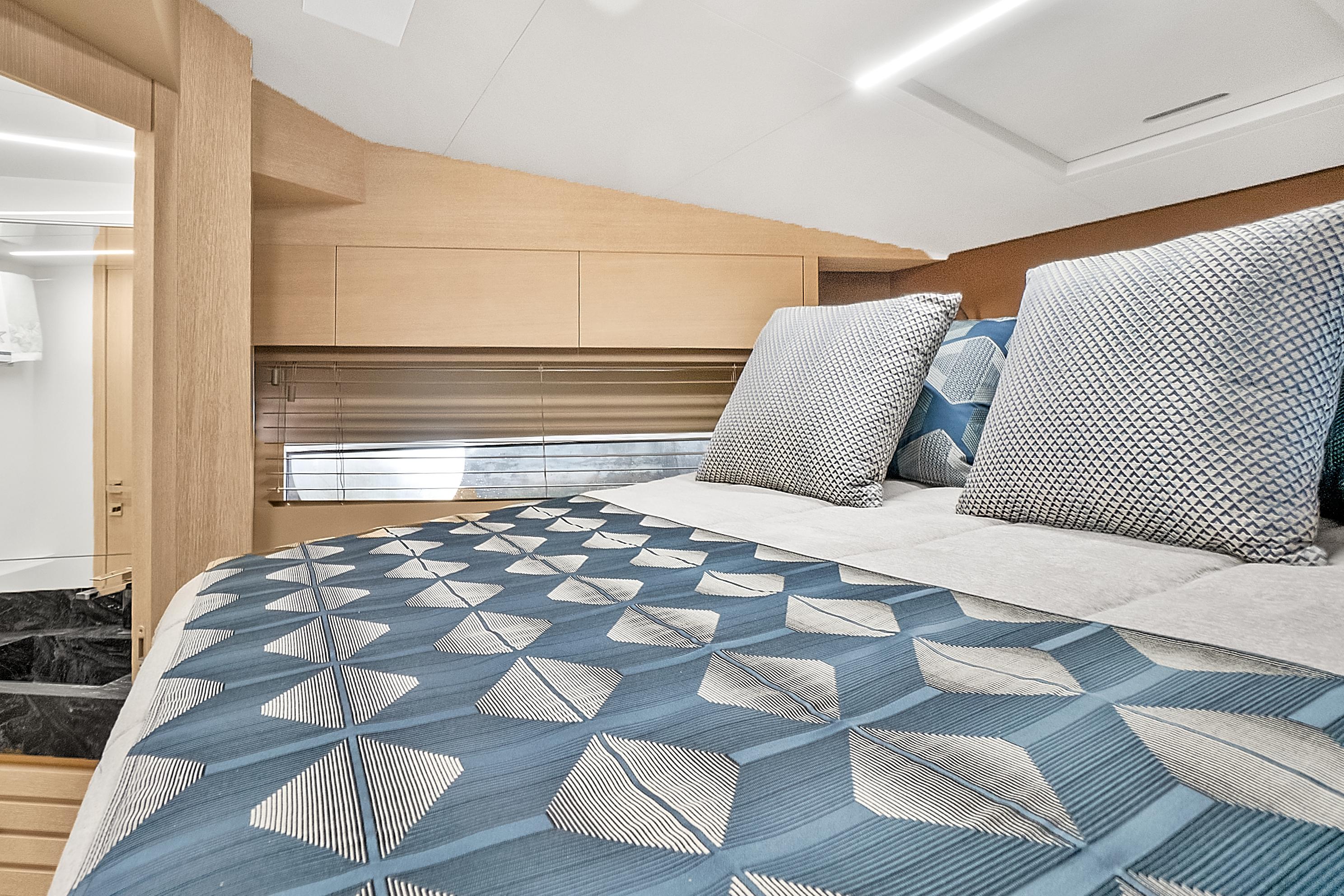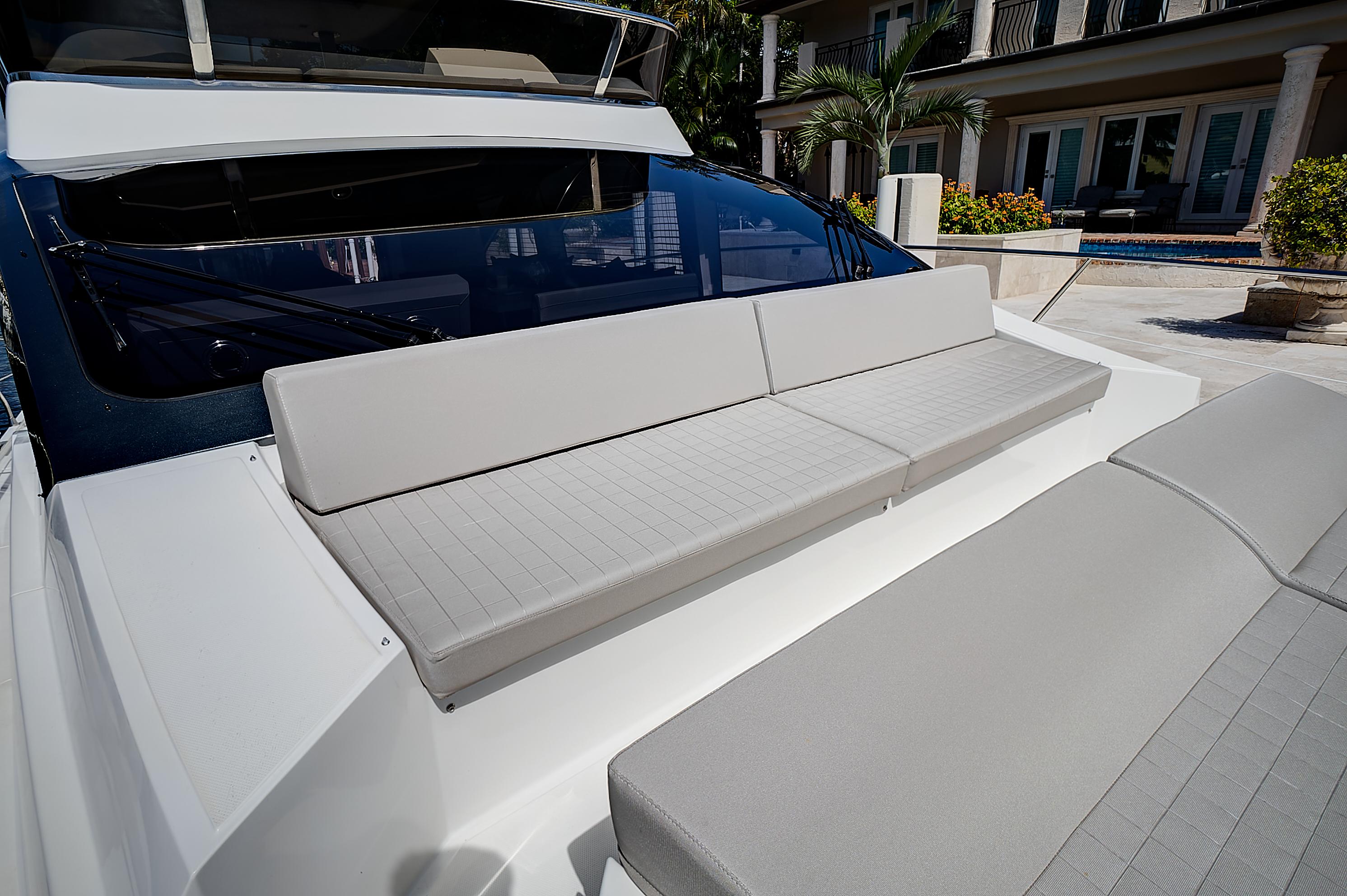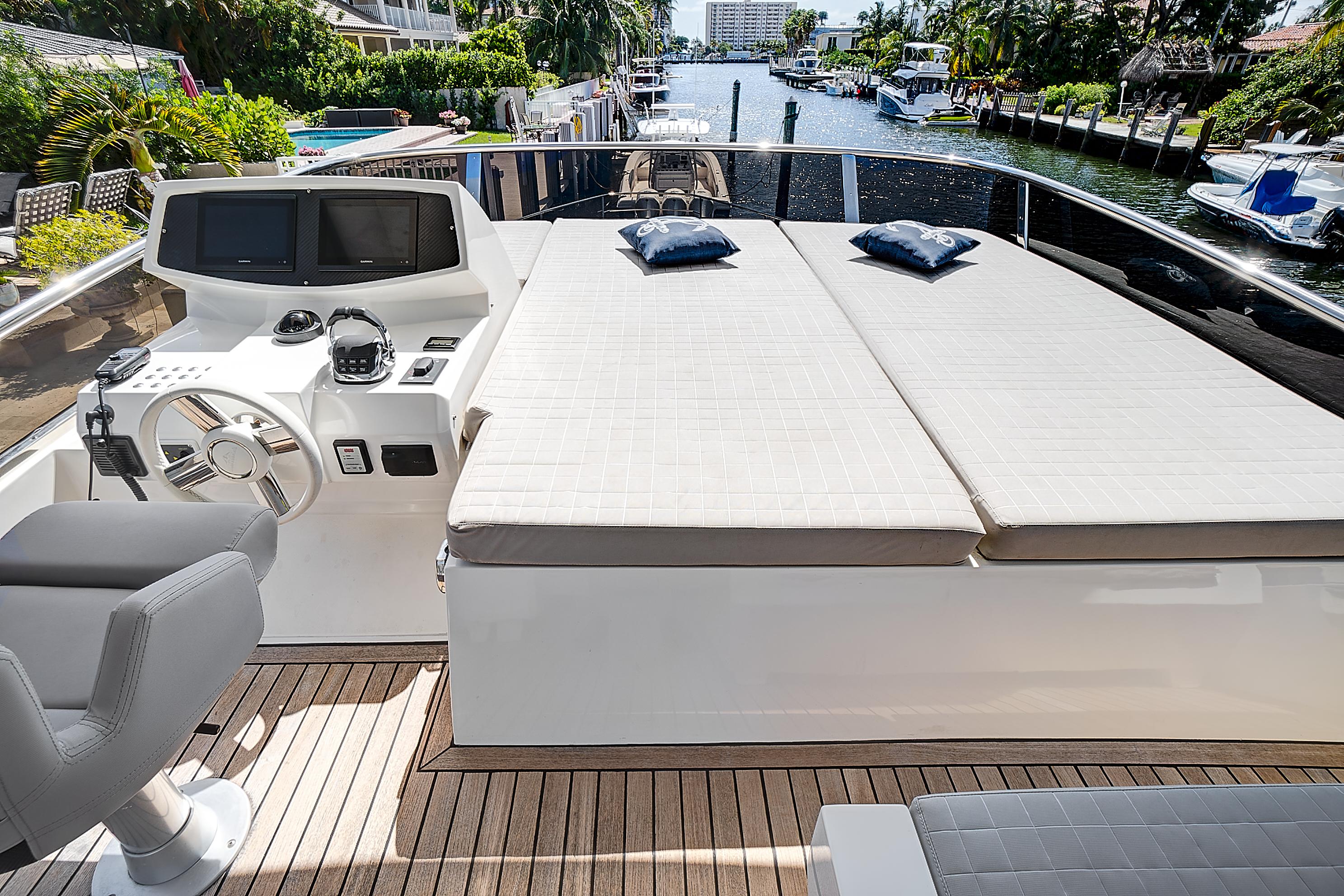 As a sport cruiser, the Astondoa 52 Flybridge feels like a much larger yacht, yet handles with ease, emphasizing the outdoors. The flybridge adds sporty function and style, accommodating a sun pad and L-shaped seating that surrounds the helm station covered by a hardtop that employs a retractable canvas sunroof. A dining table folds to cocktail size, while the wet bar, grill and refrigerator offer more amenities for entertaining. The broad bow sun pad adjoins a Portuguese lounge, providing breezy sunning in cushioned comfort.