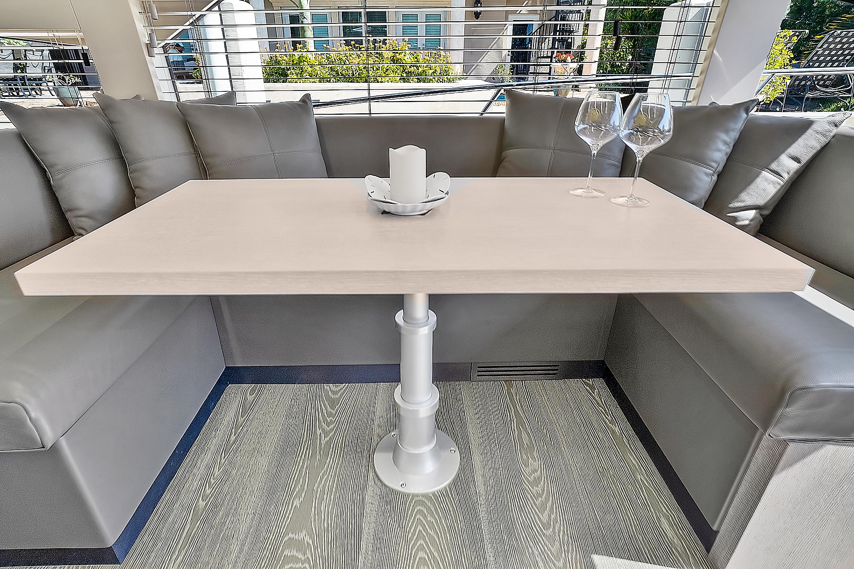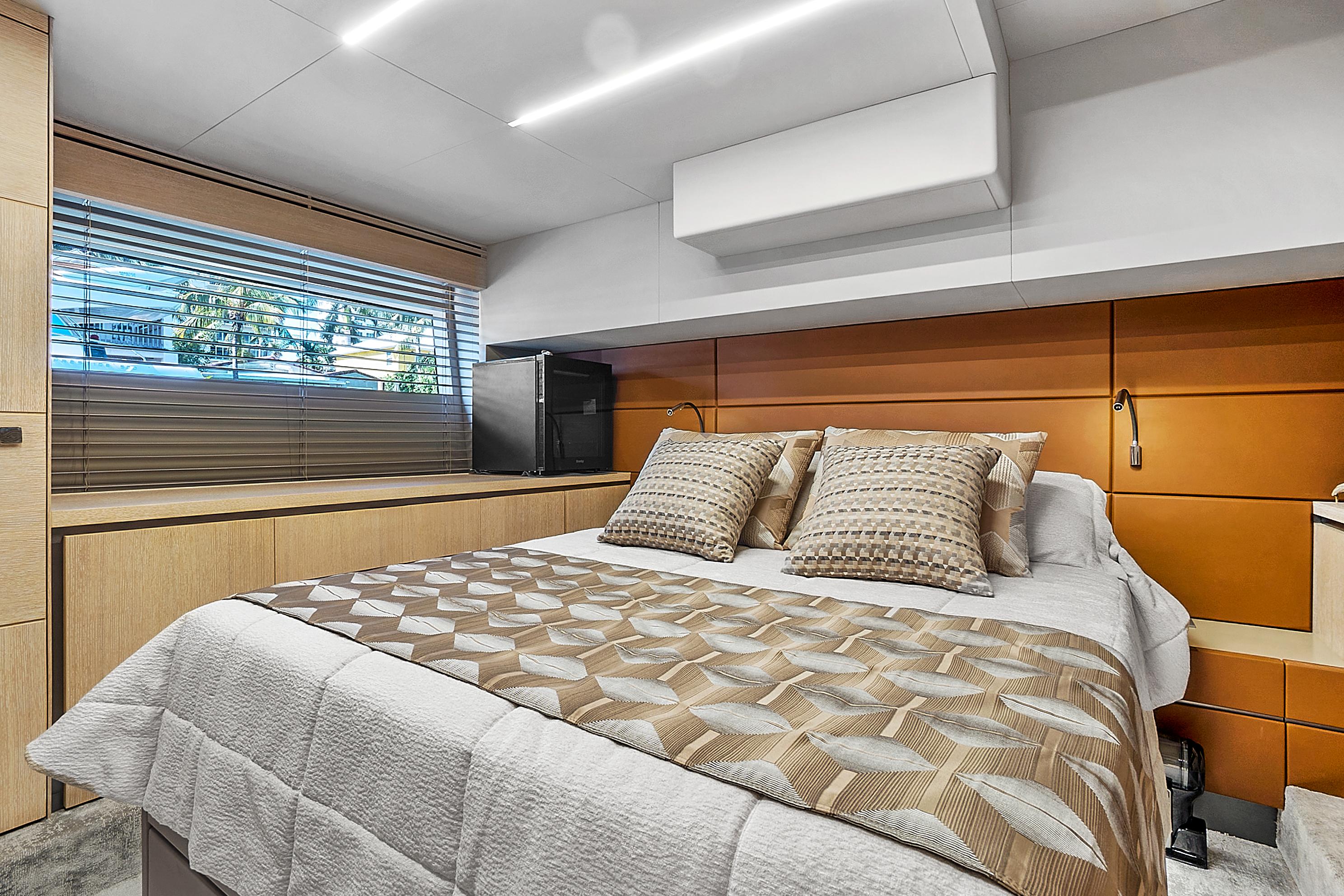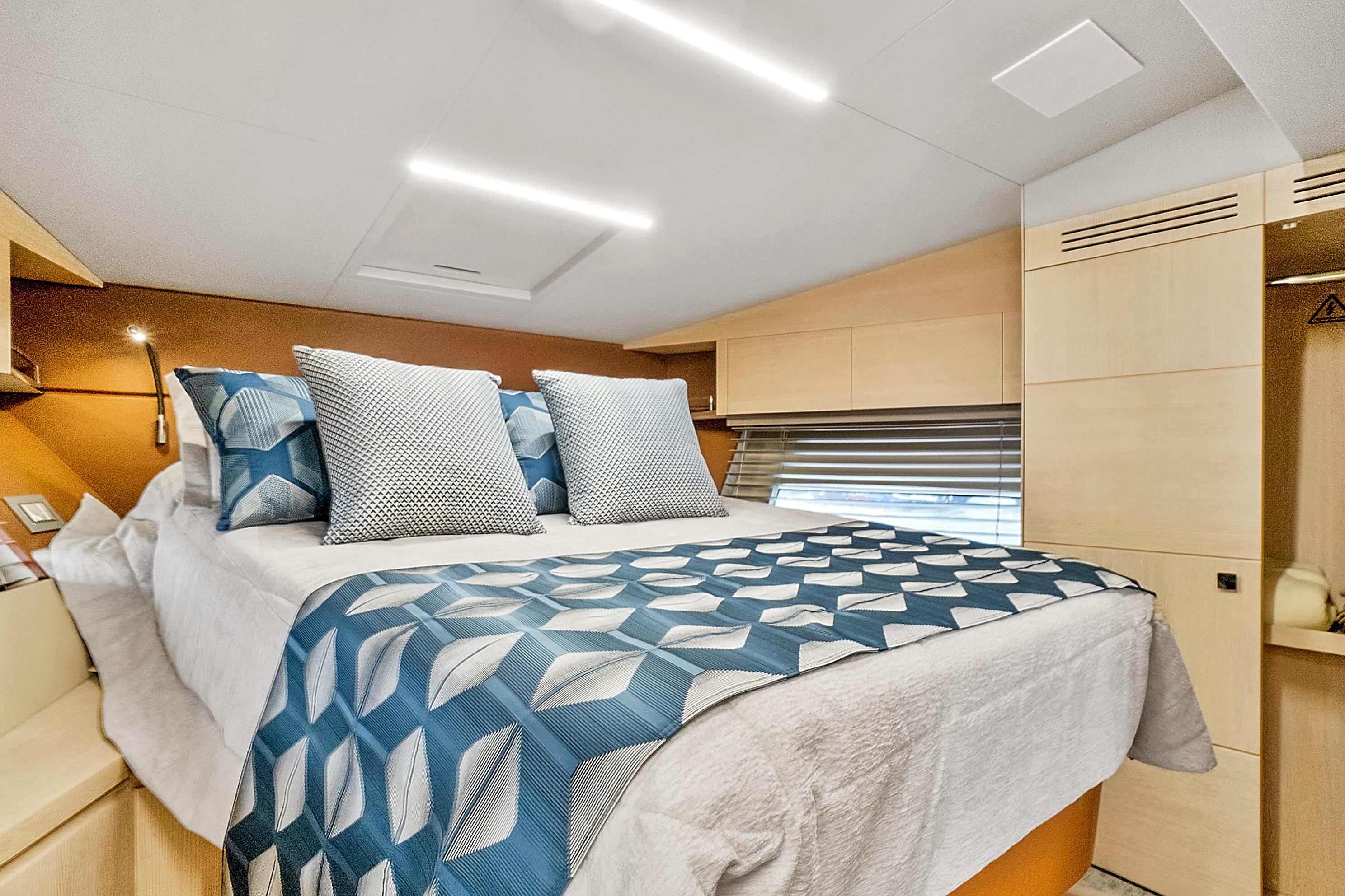 As a sport cruiser, the Astondoa 52 Flybridge feels like a much larger yacht, yet handles with ease, emphasizing the outdoors. The flybridge adds sporty function and style, accommodating a sun pad and L-shaped seating that surrounds the helm station covered by a hardtop that employs a retractable canvas sunroof. A dining table folds to cocktail size, while the wet bar, grill and refrigerator offer more amenities for entertaining. The broad bow sun pad adjoins a Portuguese lounge, providing breezy sunning in cushioned comfort.