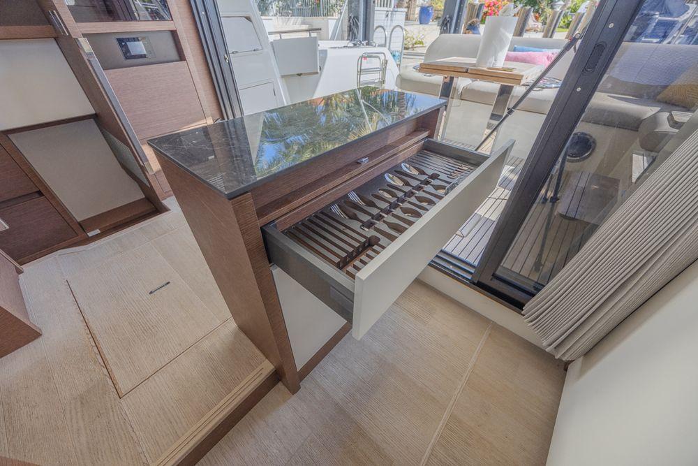 - Seamless Living Spaces: The expansive saloon, bathed in natural light, flows effortlessly into the helm station and the exquisite galley. Flush floorboards connect the elegant interior to the exterior cockpit, where an inviting L-shaped bench awaits for dining and relaxation.