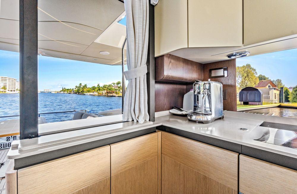The use of extensive glazing, a familiar Absolute trademark, is particularly visible in the saloon, from where there are fantastic 360-degree views. In addition to air conditioning, natural ventilation can be provided by the electrically-controlled vertically sliding windows. The galley is fully equipped, and, unusually for boats of this size, there is also a spacious pantry.