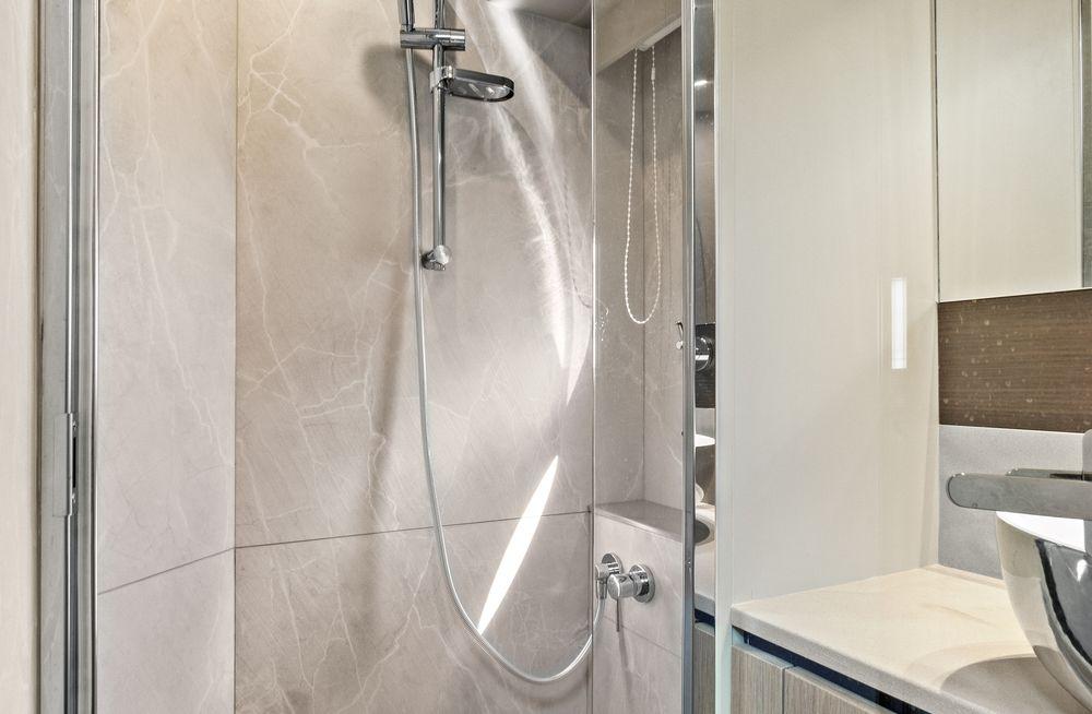 The VIP guest cabin midships could in every way be considered a second master, in terms of space, headroom, en-suite bathroom and finish. The third guest cabin has an electricalsystem, fitted as standard, for seamless transformation from twin berths to double. In addition, there is a versatile crew cabin, with practical access from the stern platform.