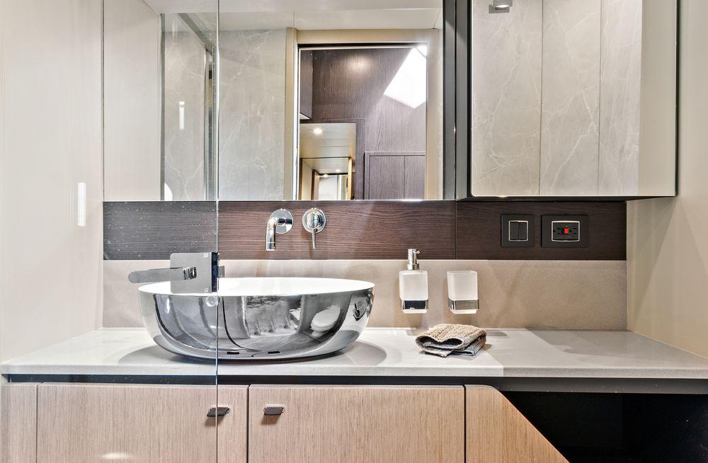 The bow location of the master cabin ensures peace, silence and privacy. Its full-beam layout optimises space, with a large double berth accessible from all three sides, extensive cupboards and storage units, and a superb marble bathroom.