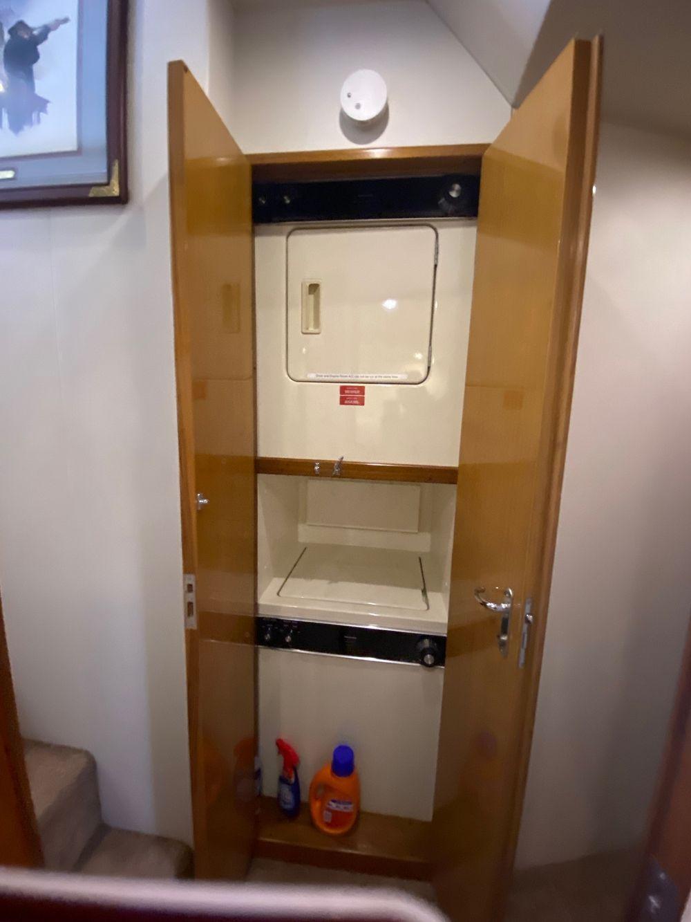 Proceeding forward down the three steps there is a stackable Kenmore washer and dryer to port. The companionway has beautiful teak hand rails.
