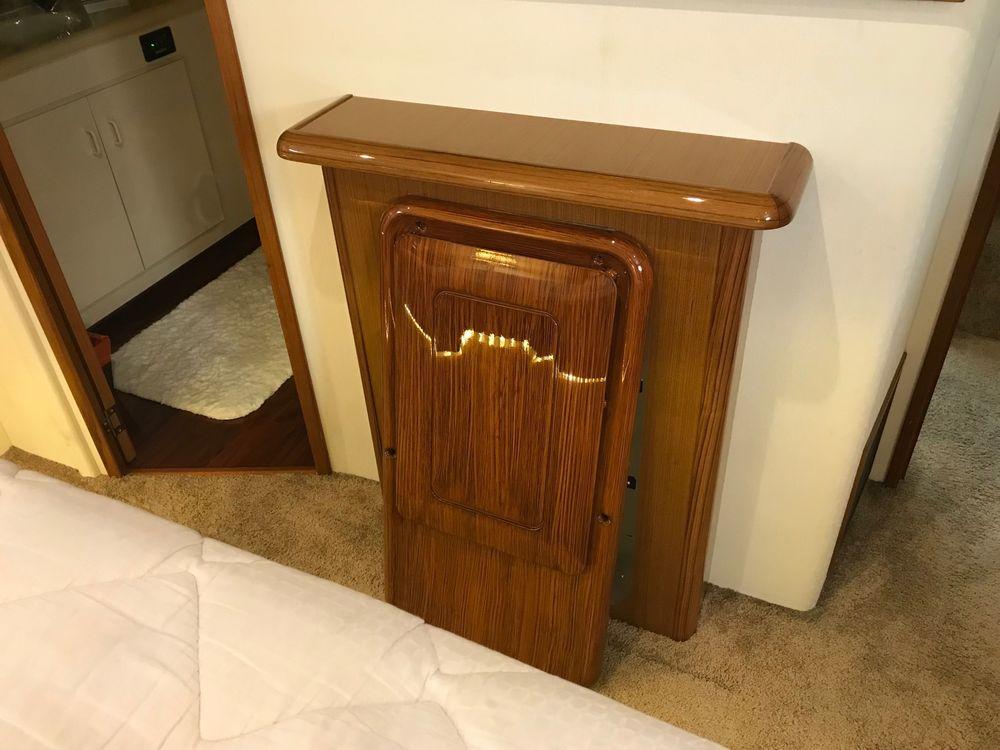 The walk in cedar lined hanging locker that is located to starboard is over sized and has a built in safe. Also along the starboard side there are built in drawers. High water and fire alarm panel is located close to the master berth. Another example of the safety minded owner. Twin night stands will hold your book and glass of wine. Along the port side is located a custom dressing table with mirror and makeup lighting. A second hanging locker is located between the dressing table and the entrance to the en-suite head.