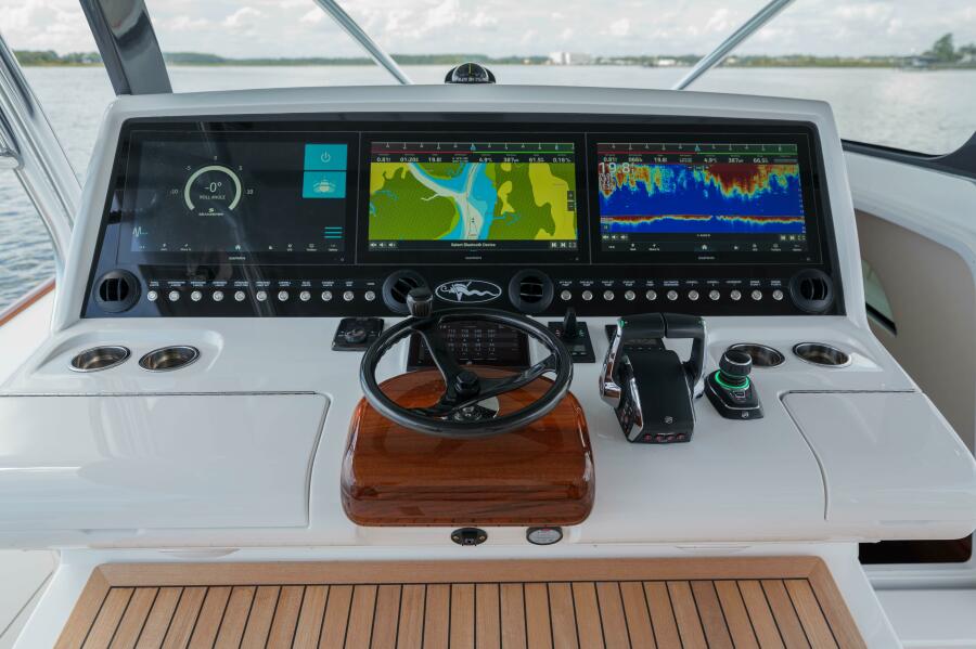 - (2) Icom M410BB VHF Radios, 15w hailer with speakers mounted above helm foot rest