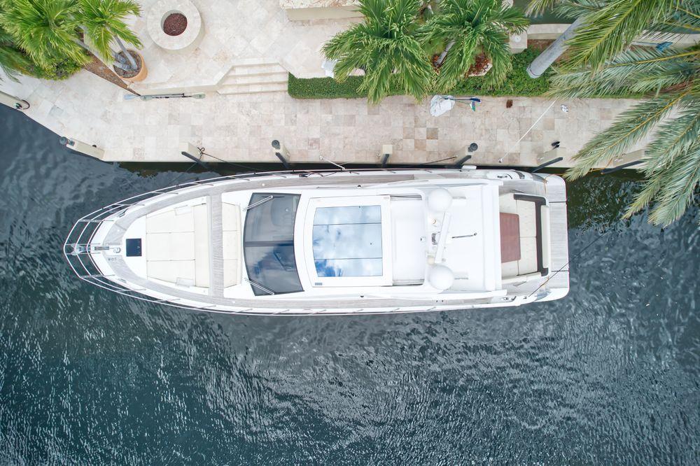 The 2013 55' Azimut 55S yacht showcases a sleek and dynamic design, characterized by its almost vertical bow. This vessel commands attention with its impressive speed, effortlessly challenging the forces of the sea. As it moves through the water, the yacht leaves a trail of spray and foam in its wake, showcasing its dominance over the waves.