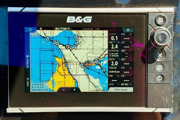Freedom also has an extensive B&G electronics package with 5 MFD, Navionics Platinum Plus navigation software, Starlink, Iridium Go with arch-mounted antenna, cell phone booster with arch-mounted antenna, WIFI and Bluetooth integration, and a 2000-watt sine wave inverter. Yanmar engine data is integrated into the MFD network to have visibility into fuel burn and engine data.
