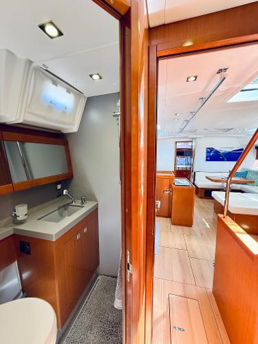 The master head is divided with the ensuite shower to starboard and the head to port! The head features a freshwater vacuum flush marine toilet, vanity, mirror, and sink. There is also plenty of storage for toiletries.
