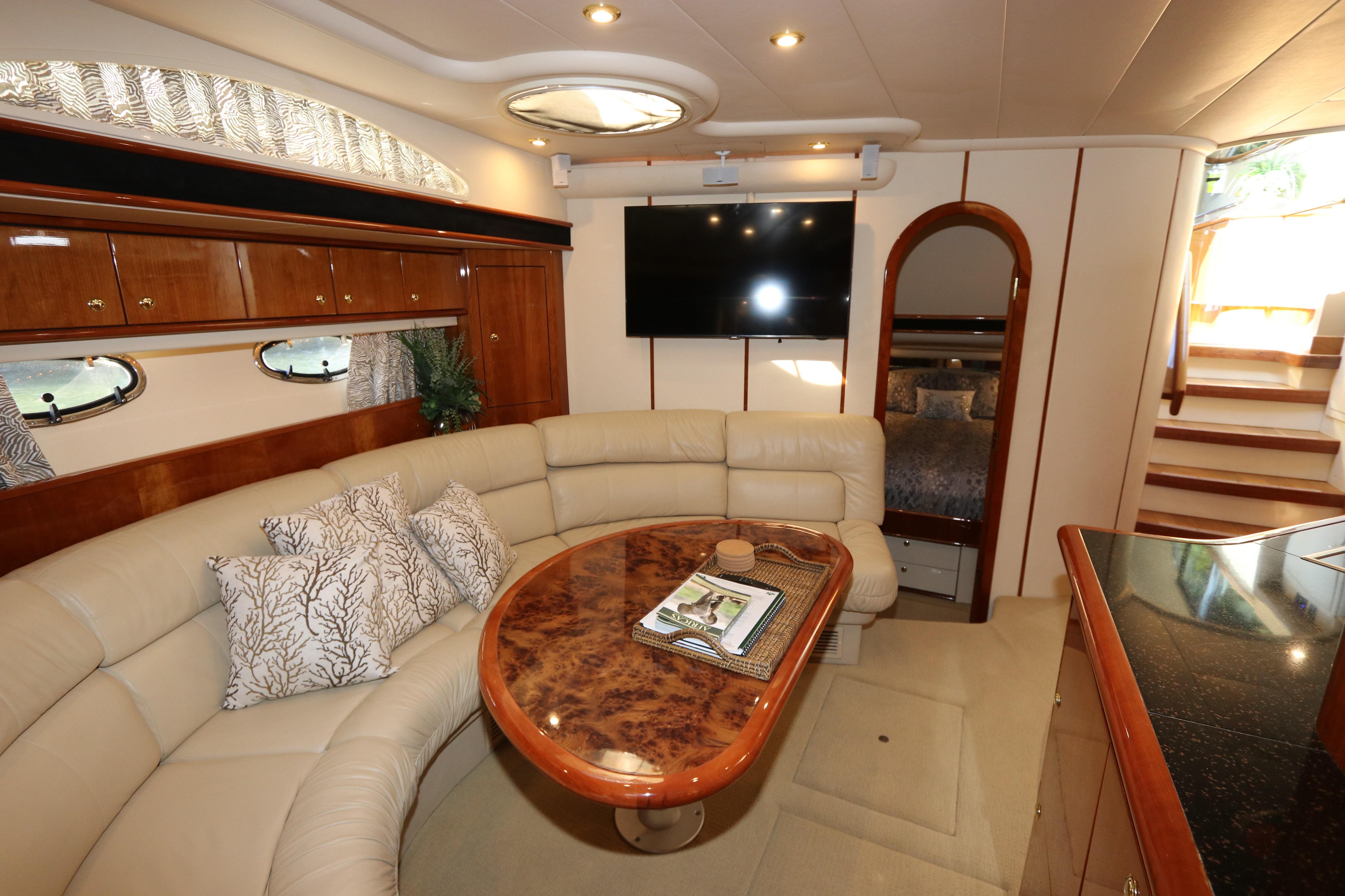 If you can pull yourself away from the comfortable ambience of the aft deck you may enter into the upper saloon/helm deck. The fun just continues here. The addition of a new 44' Samsung TV (2021), Polk Sound bar(2021), and internal speakers (2021), one may dance the night away. An L shaped settee to starboard has a beautiful table with Burl accents and to port is the entertainment center. Tasteful ultra leather seating, new designer drapes, and carpet (2021) all complement the wonderful amount of natural light provided by large side windows and of course the total windshield across the front of the pilothouse. (New wiper blades 2021) As FIVE STAR handles like a sports car it is only befitting that she should have an opening convertible top. The center window in the windshield is also power operated and will open at the touch of a finger.
