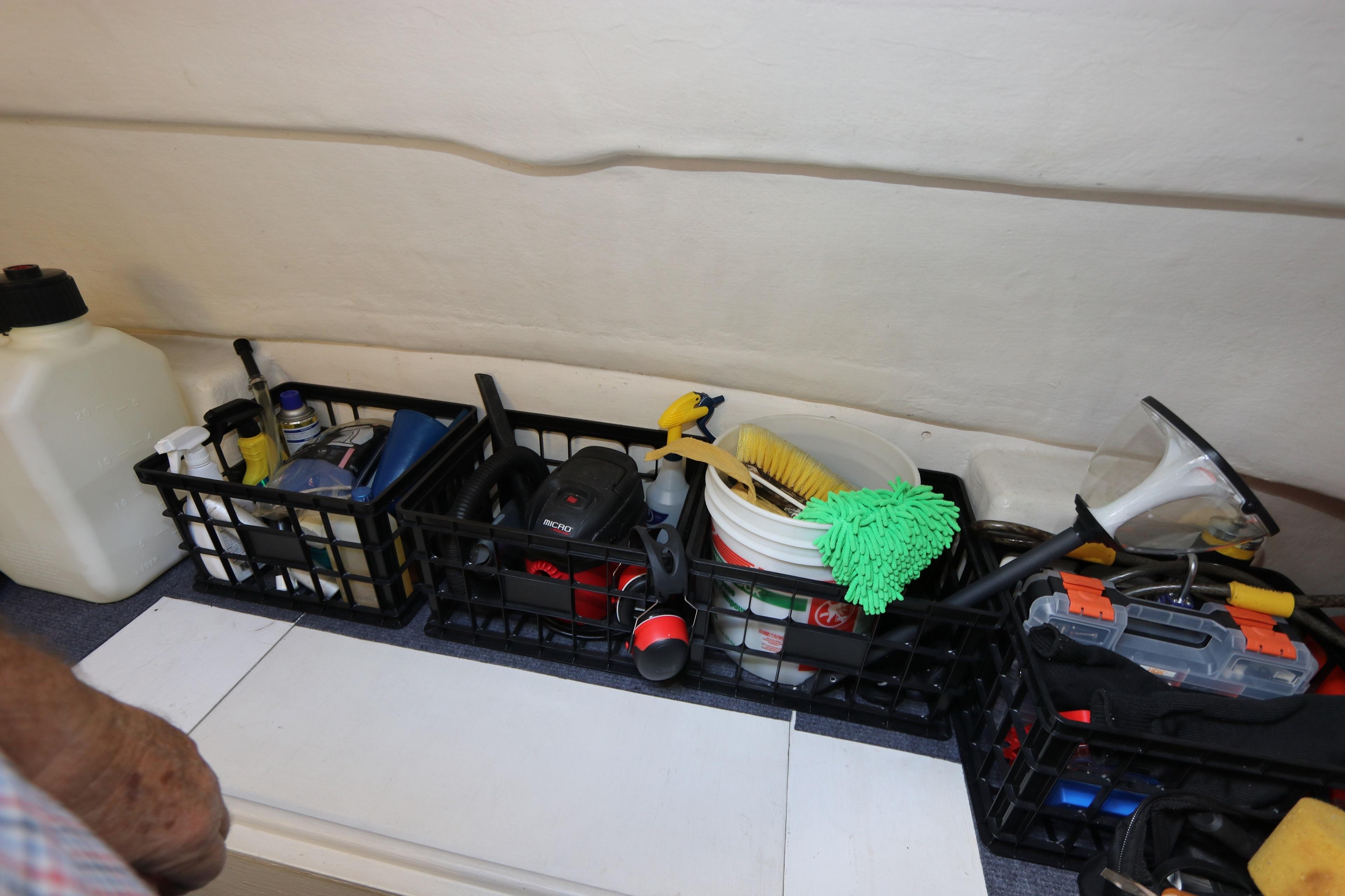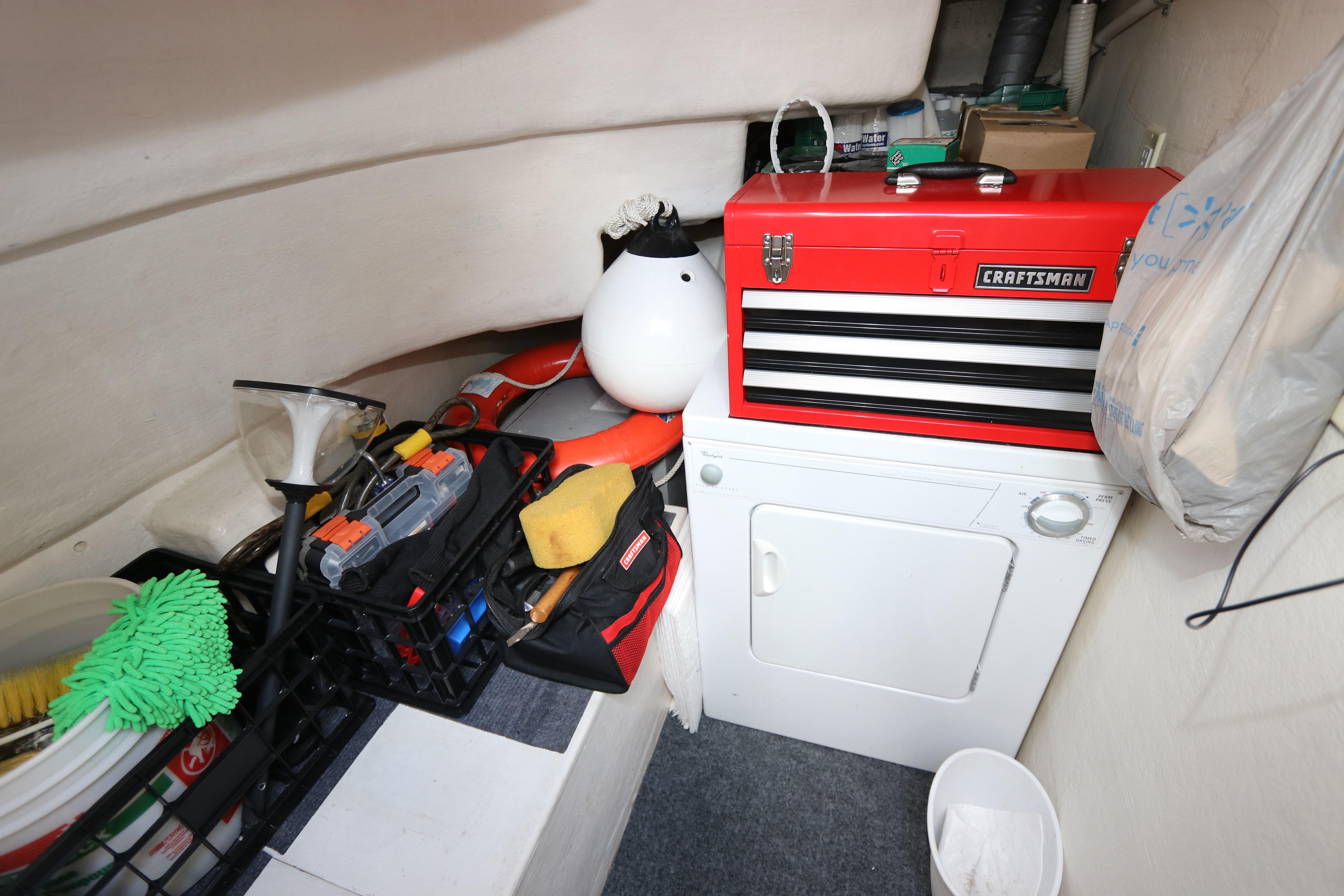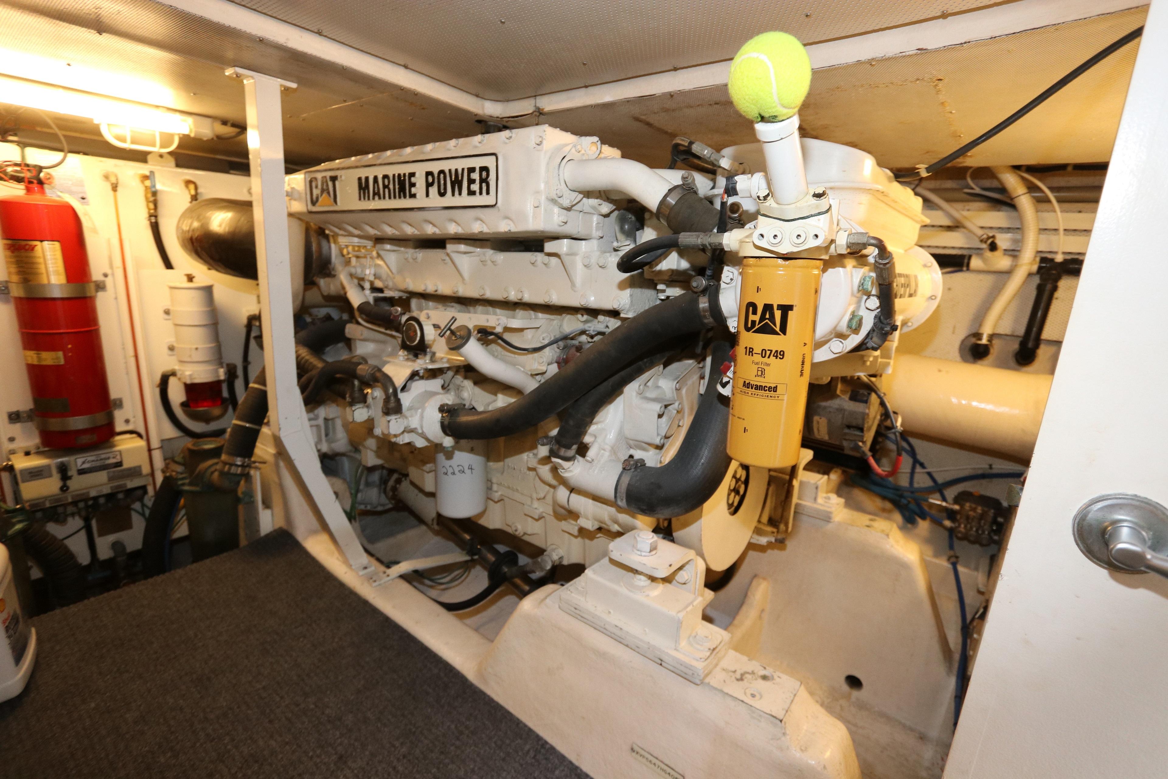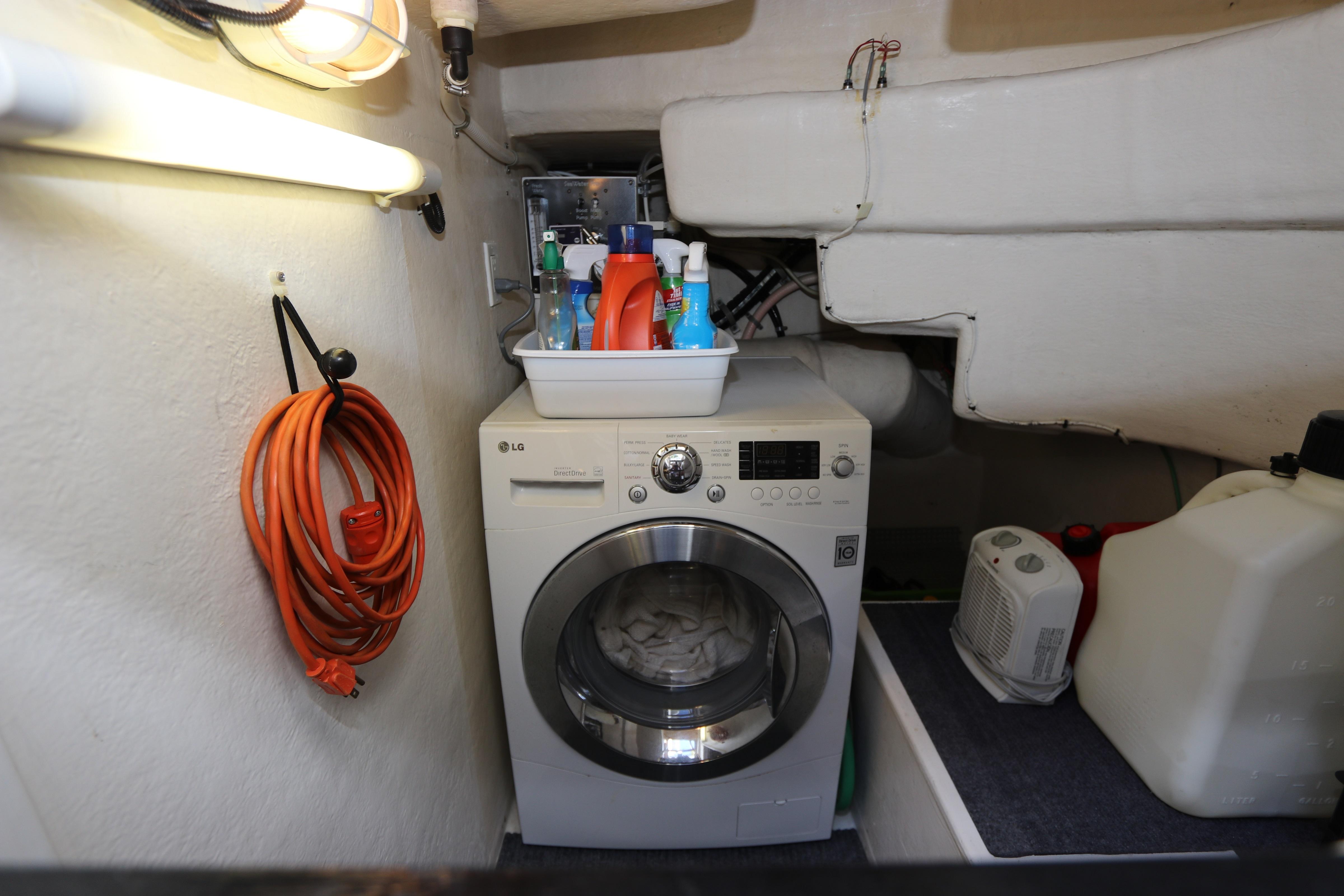 The aft center of the seating lifts up to show a user friendly set of steps leading down to the Laundry room, the spare store room and the engine room. There is ample storage outboard on both sides in this area as well as separate washer and dryer. Heading forward one enters through the watertight door into the engine room filled with 2 very well mannered Cats.