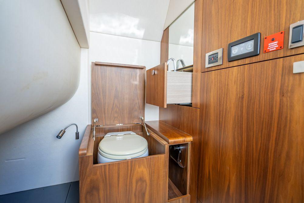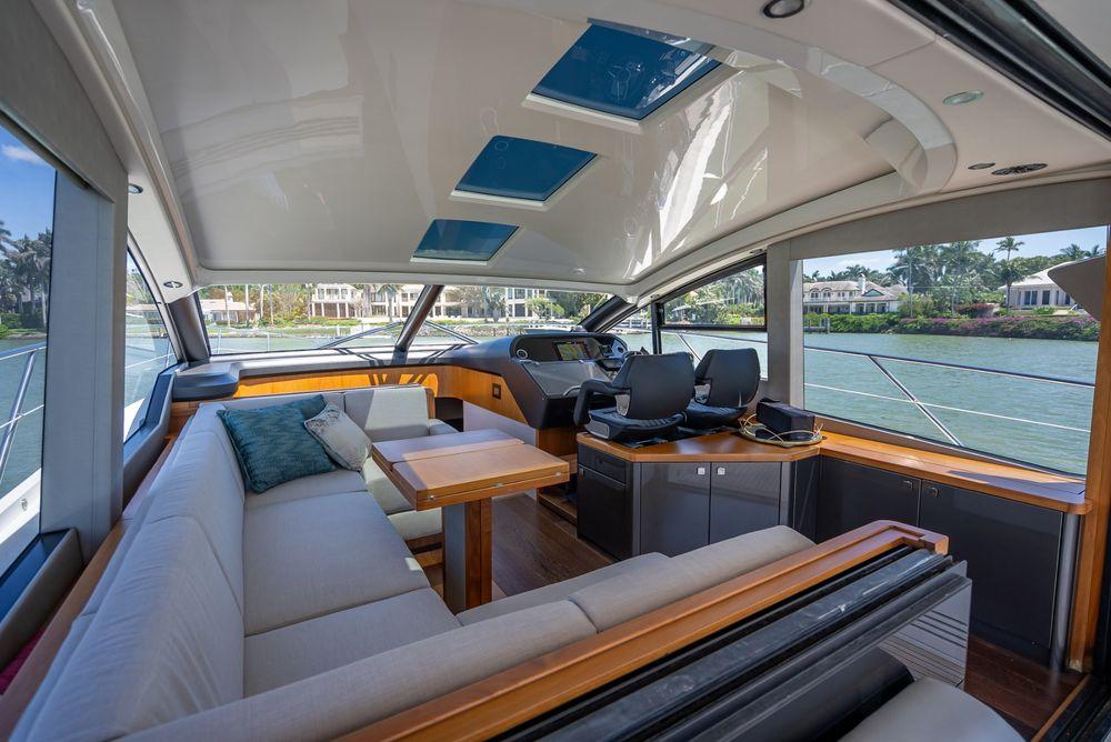 - Large electric sunroof & sliding glass cockpit door with draw down mechanism at seating to fully open the space between the main salon and cockpit area, great for entertainment & cruising