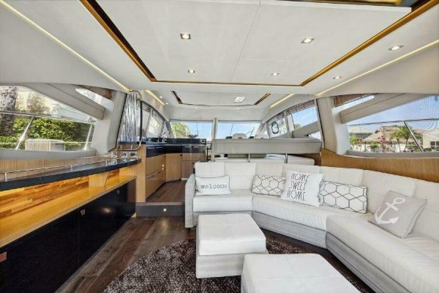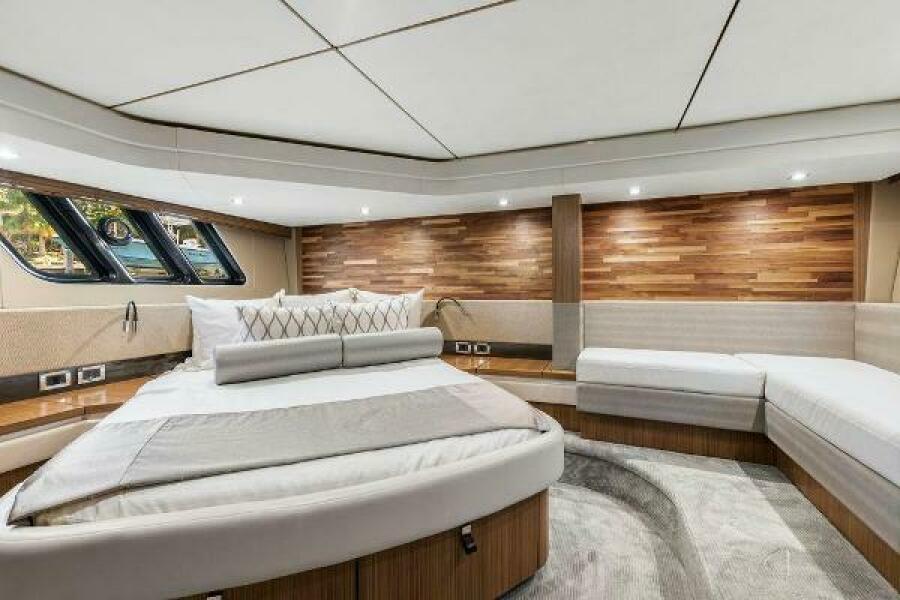 Step into a world of elegance inside GRATITUDE. The salon is a showcase of refined craftsmanship, with lo-gloss wood finishes, premium upholstery, and panoramic windows that flood the space with natural light. The open-concept design seamlessly connects the salon, galley, and dining area, creating an inviting space for entertaining.