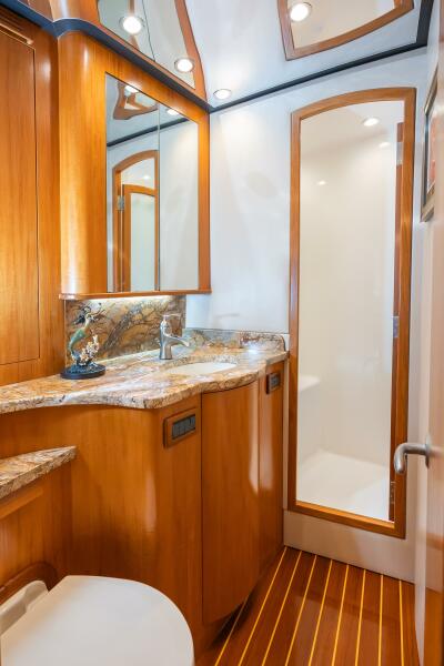 Master stateroom to port with diagonal queen bed with drawer storage under and private head with shower