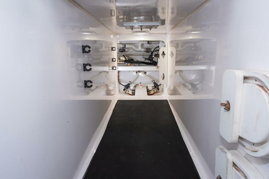 Companionway tackle storage room with rod storage and shelves for additional tackle storage