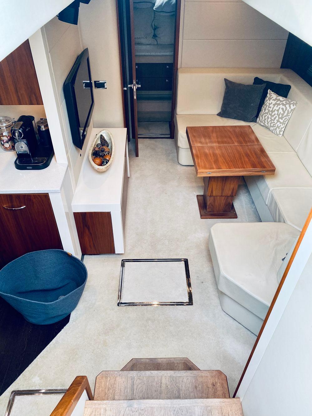 This 40-knot speedster is as much about performance as it is about comfort. A high performance hull belies the space onboard, where accommodation is optimised. Both open and hard top versions are available. And as well as a choice of engines, theres also an option in drive systems. The more compact pod drive saves engine room space enabling an enlarged master suite. Luxury is extended throughout with a large main deck area providing ample space for dining and entertaining. Large sunpads are positioned fore and aft and the garage provides ample storage for tender or jet ski. Down below the saloon and three guest cabins all offer a typically high level of comfort and feature their own entertainment systems.