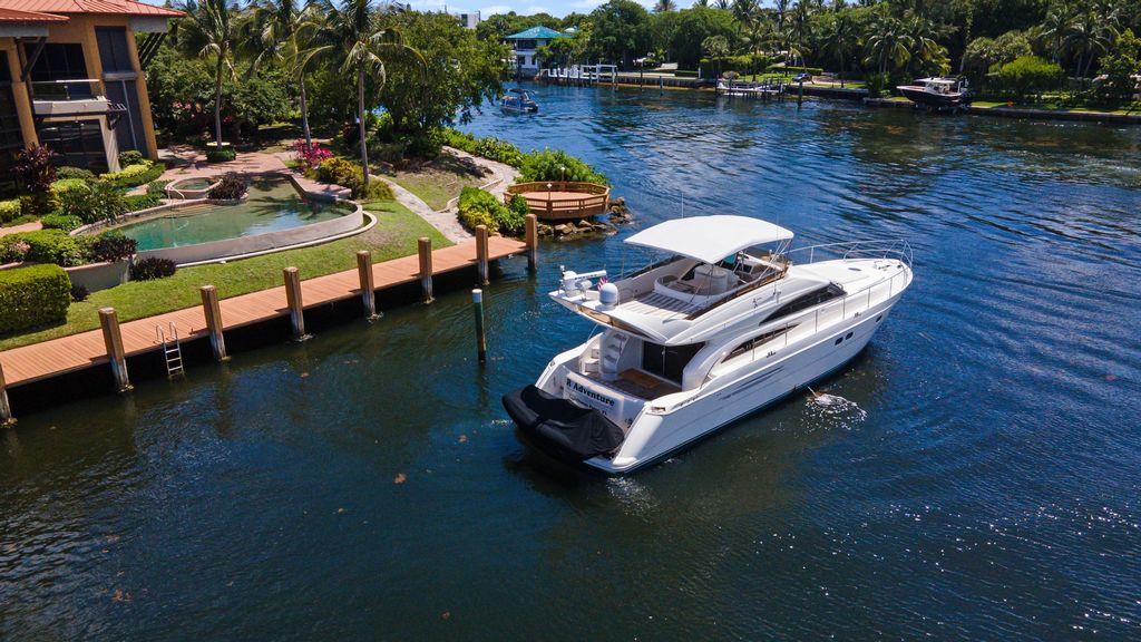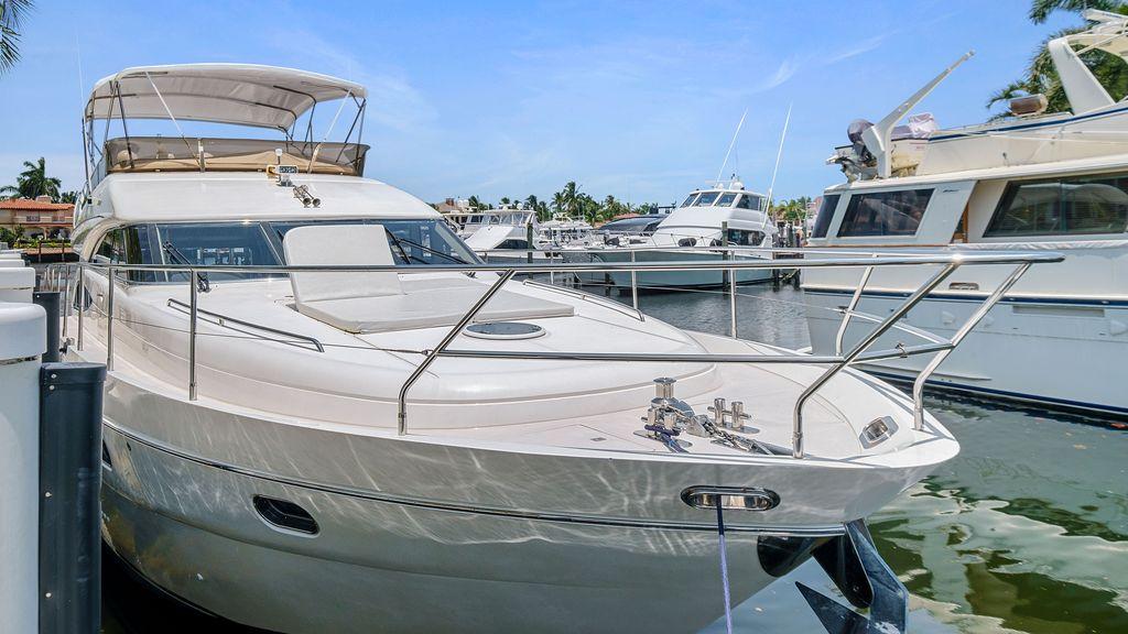 The upper deck includes tons of seating for all, including a queen-sized aft facing sunpad area, wet bar, electric grill, and beverage refrigerator. A new custom engineered bimini top with oversized reinforcing supports was just added to handle even the heaviest of seas.
