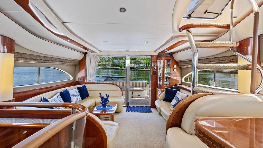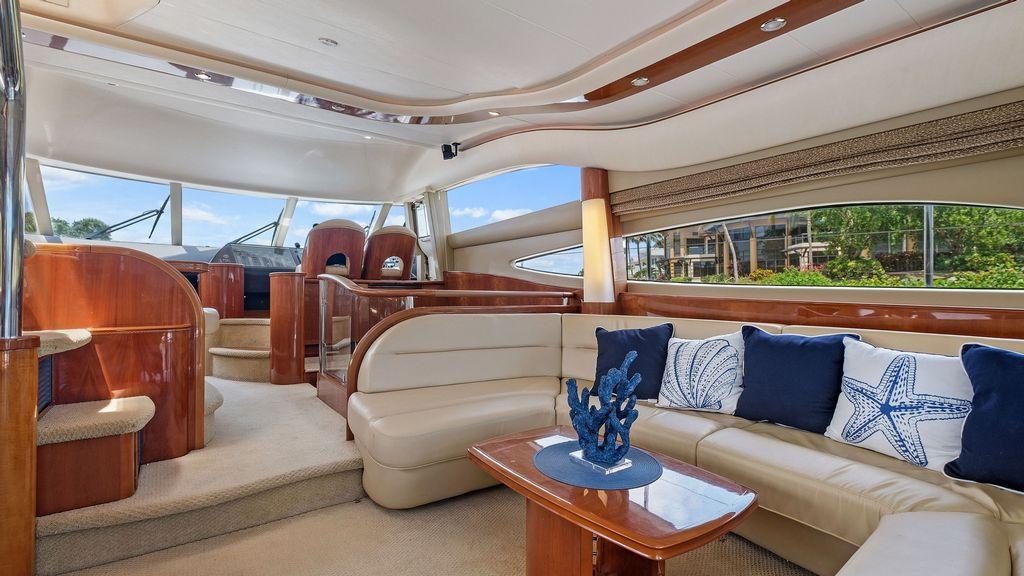 Forward facing large settee extending the length of the transom w/ 2 additional teak chairs and a hi-lo teak table. Power rear salon window allows full access to aft deck for entertaining.
