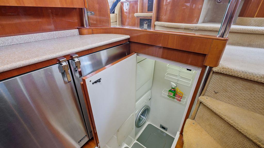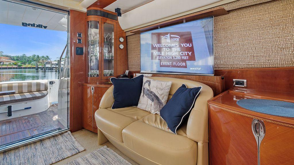 This area features a large C-shaped ultra-leather settee and rich cherry cocktail table. Across to starboard is an ultra-leather love seat flanked by the entertainment center and bar, and glass storage and lower beverage refrigerator. NEW custom hidden retractable 48-inch Samsung Smart TV. Just forward, an internal spiral staircase makes access to the Flybridge quick and easy. The galley is down a couple of steps just forward of the salon settee and offers complete facilities. The lower helm to starboard offers luxury automotive style seating for two and a comprehensive instrument panel with top of the line electronics and navigation equipment. The dinette seating is forward to port and allows passengers comfortable seating underway with good visibility forward and access to anyone in the salon or to the captain.