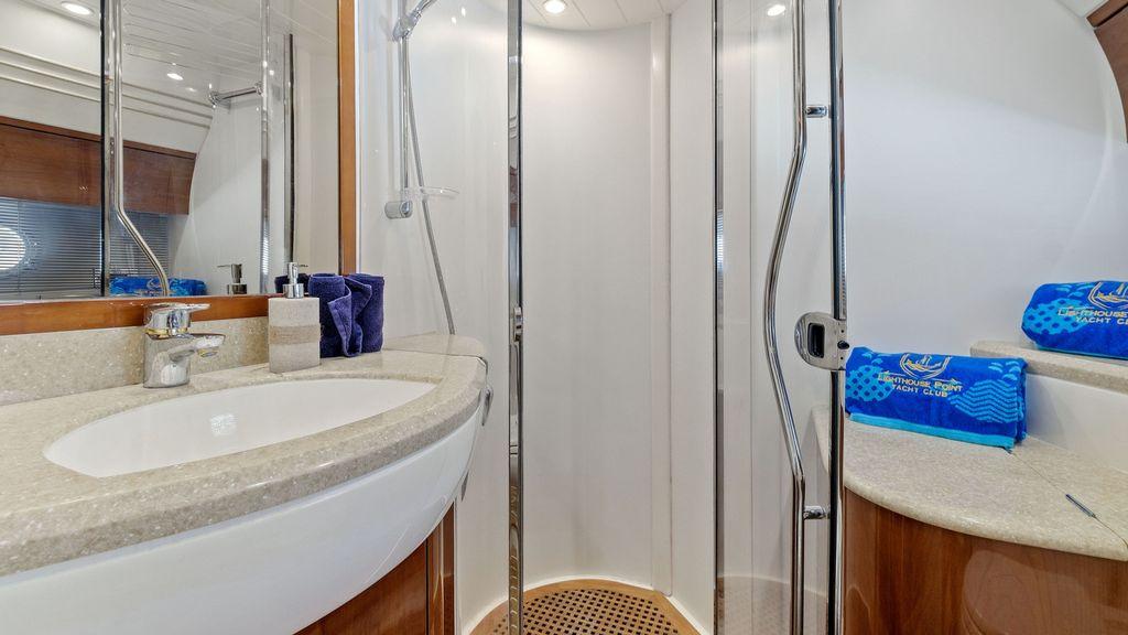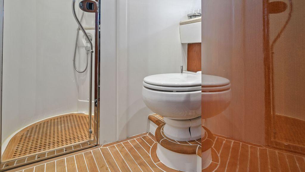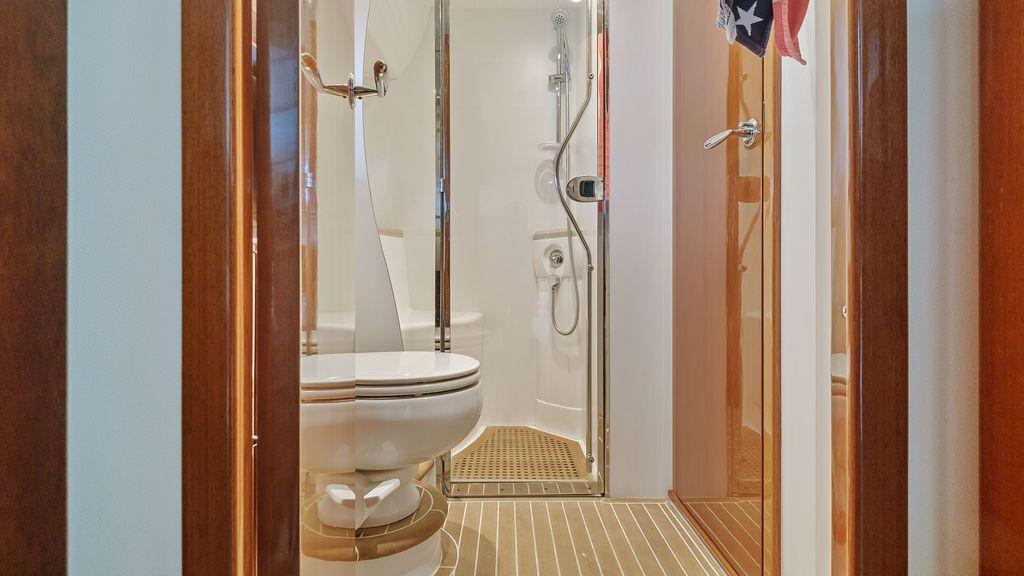 The starboard midship stateroom would be considered the first master, and features a queen berth, AC, make-up table/ stool, full closet, lots of drawers for storage, entertainment center, and private ensuite head and stall shower- both with custom teak flooring.