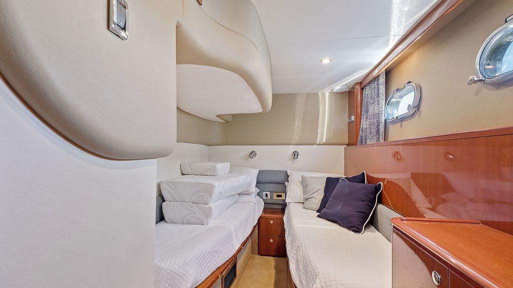 The port stateroom offers twin beds (w/ king filler sections), AC, and private access to the port head with shower. This head is also accessed from the companionway for day head use.