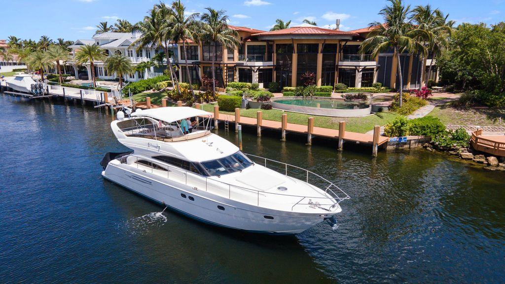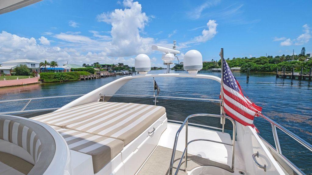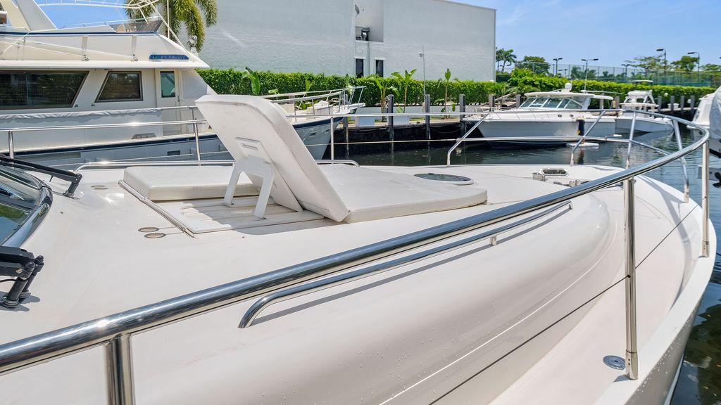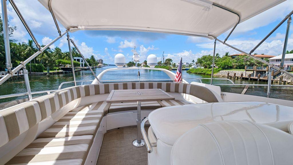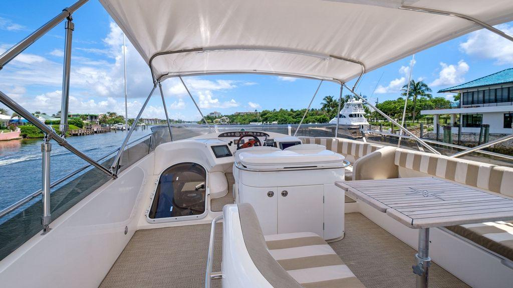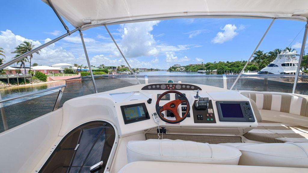 The upper deck includes tons of seating for all, including a queen-sized aft facing sunpad area, wet bar, electric grill, and beverage refrigerator. A new custom engineered bimini top with oversized reinforcing supports was just added to handle even the heaviest of seas.