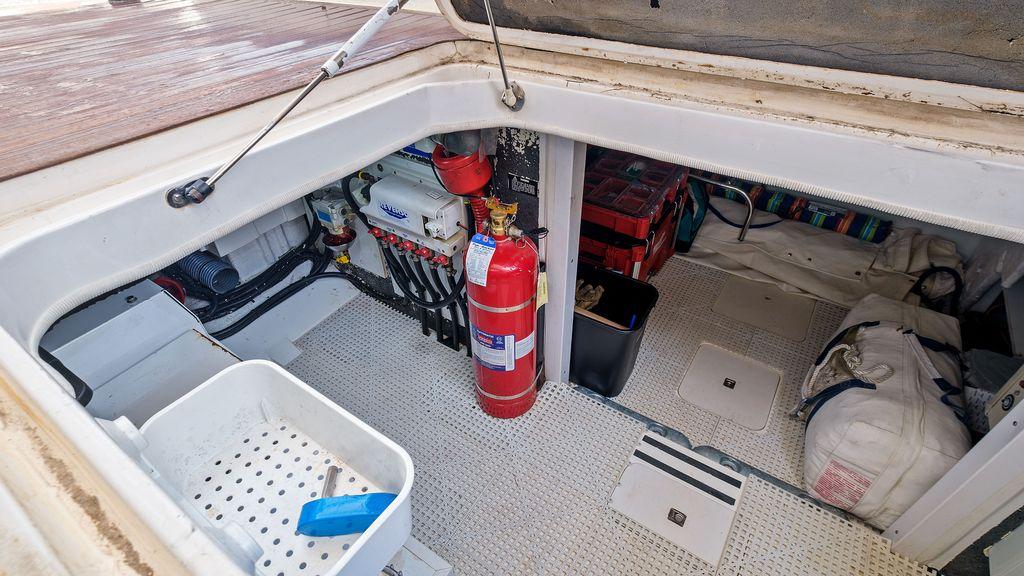The port stateroom offers twin beds (w/ king filler sections), AC, and private access to the port head with shower. This head is also accessed from the companionway for day head use.