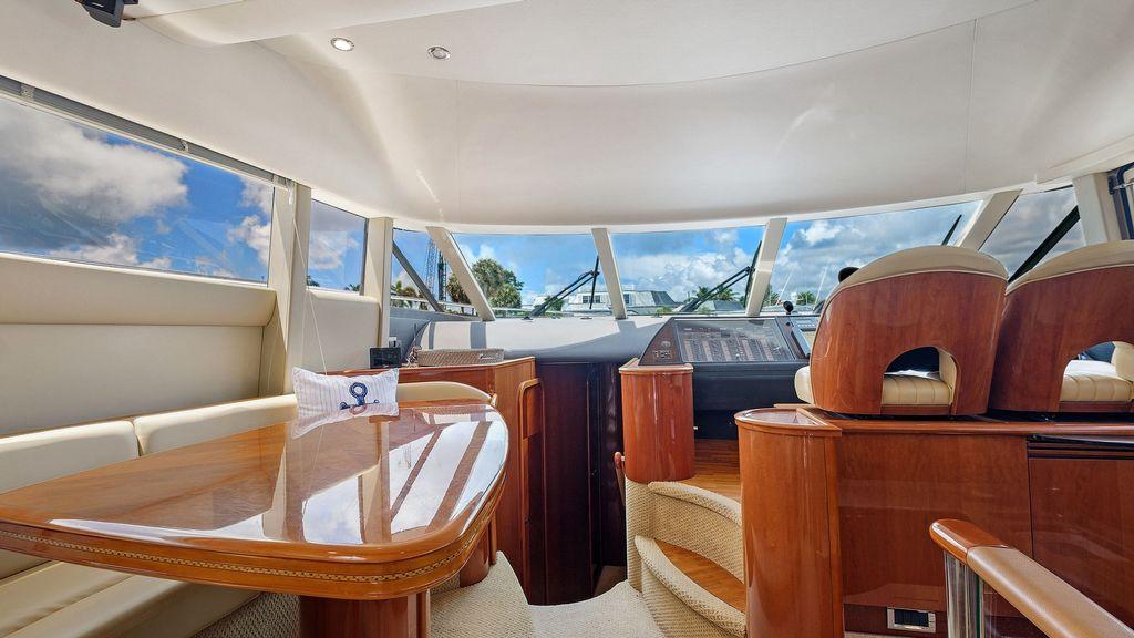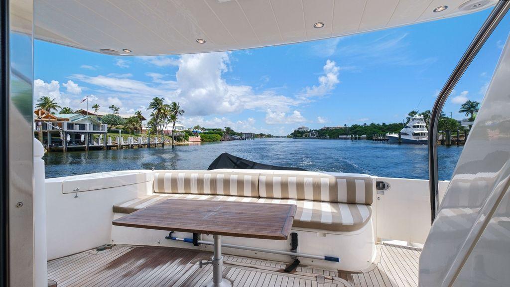 Forward facing large settee extending the length of the transom w/ 2 additional teak chairs and a hi-lo teak table. Power rear salon window allows full access to aft deck for entertaining.