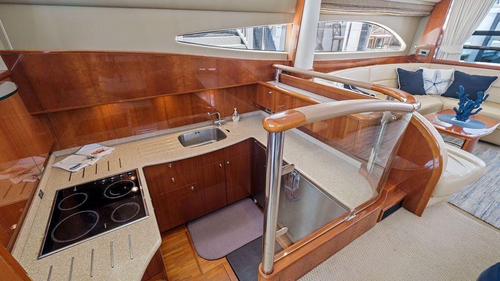 This area features a large C-shaped ultra-leather settee and rich cherry cocktail table. Across to starboard is an ultra-leather love seat flanked by the entertainment center and bar, and glass storage and lower beverage refrigerator. NEW custom hidden retractable 48-inch Samsung Smart TV. Just forward, an internal spiral staircase makes access to the Flybridge quick and easy. The galley is down a couple of steps just forward of the salon settee and offers complete facilities. The lower helm to starboard offers luxury automotive style seating for two and a comprehensive instrument panel with top of the line electronics and navigation equipment. The dinette seating is forward to port and allows passengers comfortable seating underway with good visibility forward and access to anyone in the salon or to the captain.