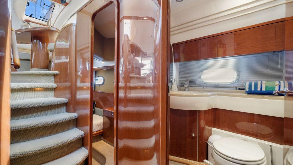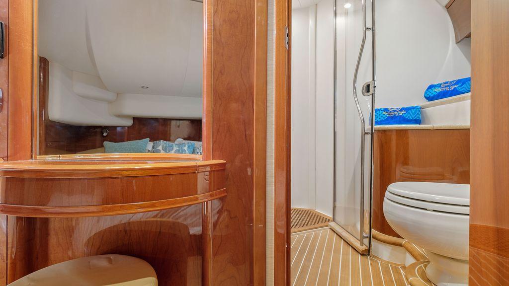 The starboard midship stateroom would be considered the first master, and features a queen berth, AC, make-up table/ stool, full closet, lots of drawers for storage, entertainment center, and private ensuite head and stall shower- both with custom teak flooring.