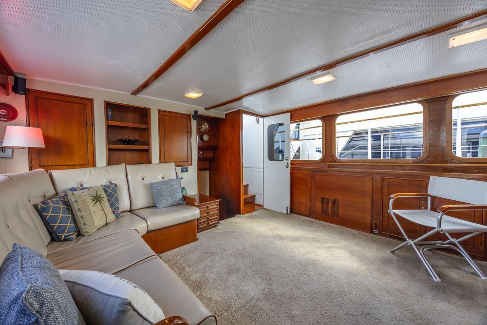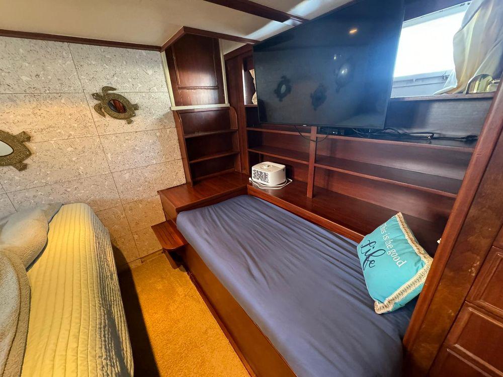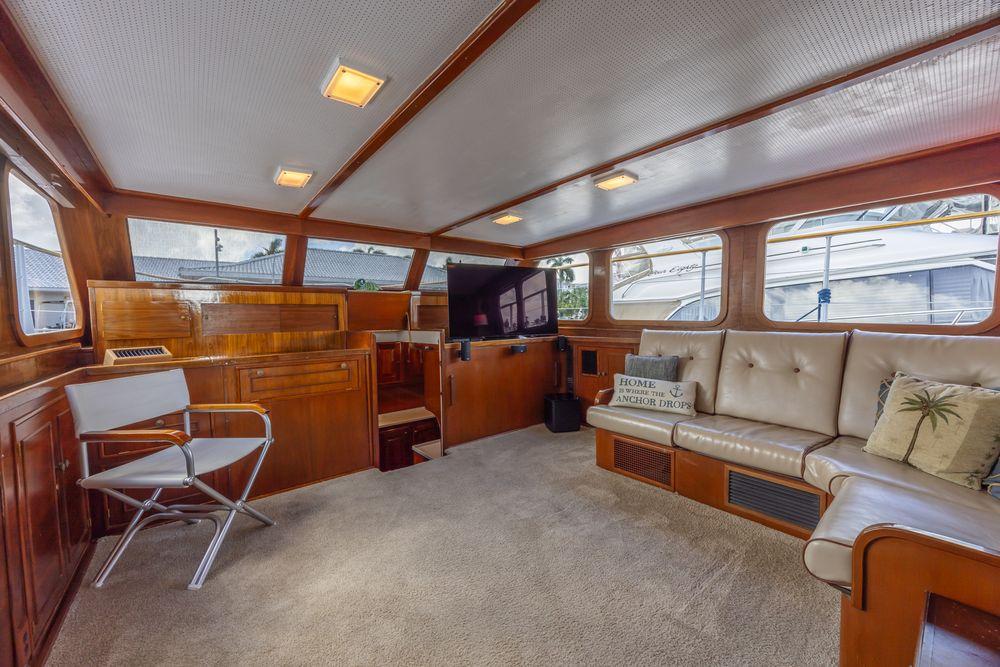 Stepping aboard BREAKAWAY through the aft boarding gate one enters the helm deck/ upper saloon area of BREAKAWAY. Looking aft one sees the stainless-steel ladder that accesses the bridge deck to starboard. Located all the way aft is a very comfortable custom semicircular settee with tables located on either end. To port there is a newly covered straight settee that was delivered on October 10, 2024. There is storage and access to the davit motor located under this settee. The teak and holly flooring is visually appealing. The amazing 360-degree view from this area is stunning. New STRATA GLASS enclosure is spectacular and keeps this fully air-conditioned area ice cold as needed while allowing for unlimited vistas. There are 2 pilothouse pocket doors to access the forward deck and one door to access the cockpit area. Located forward is the helm command station with a built-in wet bar area just aft of the rolled and tufted helm seating. The overhead is accented with teak battens giving one that lovely classic feel to this area. Recessed overhead lighting combined with the totally upgraded curtesy and mood lighting makes this area a delight to lounge in whether it is day or night. Flat screen TV, and JL speakers create a great gathering spot for catching the latest sporting event or reviewing the days Go Pro Camera videos.