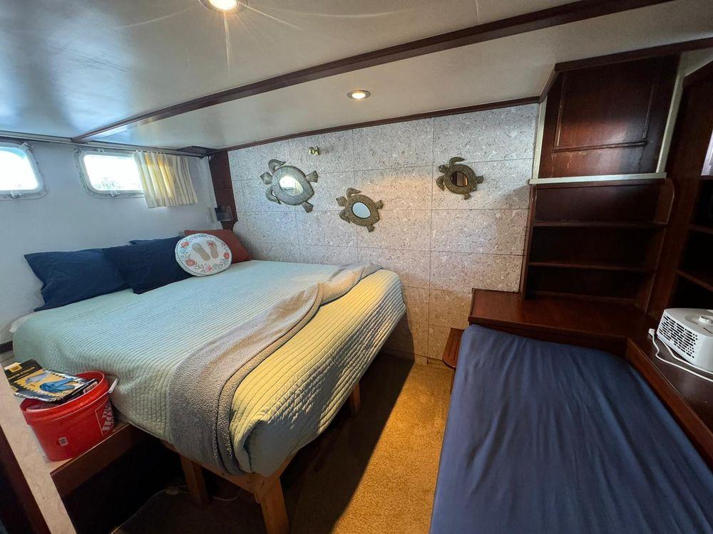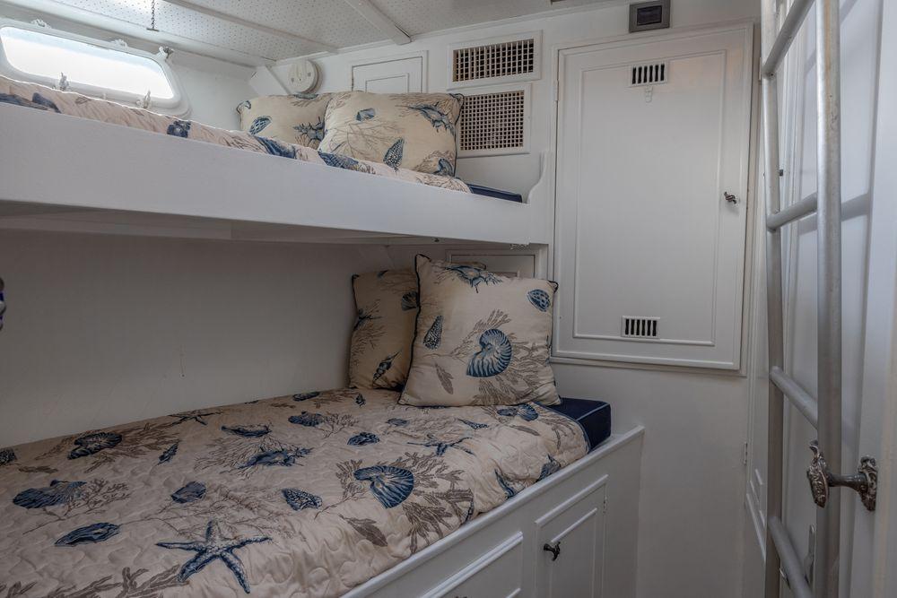 Forward of the galley is the third stateroom or crew quarters for BREAKAWAY. Over under berths are located to port and directly across from the berths is a large commodious head with a good-sized separate shower stall, medicine cabinet and silver antique door handles and hardware. VERY cool and unique. You will not find this type of silver hardware at your local West Marine Store. Forward of the head and still on the starboard side is very large hanging locker. All the way forward is access to the chain locker. One can determine how well a yacht of any age but particularly of this vintage, how well maintained the yacht is by the smells. OR AS IN THE CASE OF BREAKAWAY, THE TOTAL LACK OF SMELLS!! open the chain locker, poke your nose under the galley or head sinks and check out the bone-dry spaces found in the bilges and everywhere else below deck in this magnificent vessel.