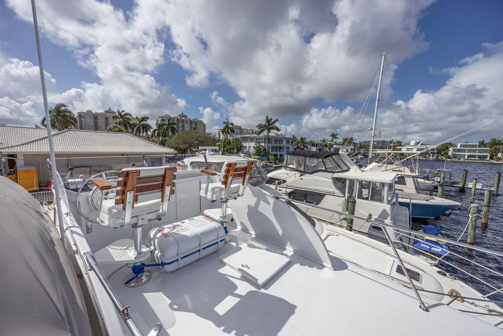But hidden away under all of this gorgeous woodwork one will find updated electrical panels, ice maker locker, storage, etc. To starboard is the stainless-steel ladder leading up to the flybridge. The fly bridge has ladder backed helm sets, a newer Bimini and a new davit. (2022)
