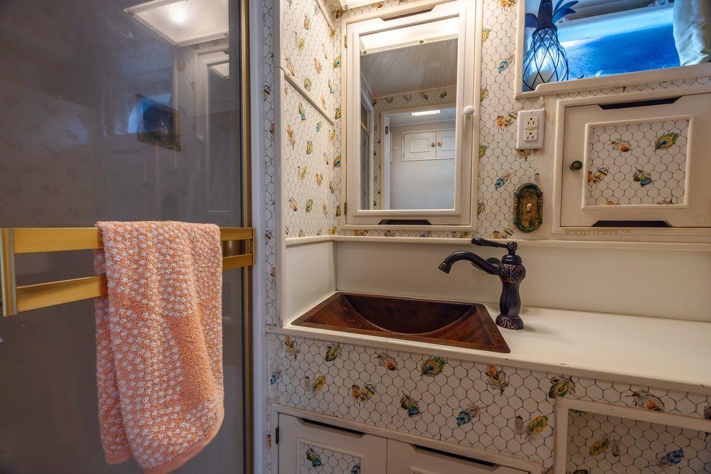 Across the hallway from the guest stateroom is the custom tiled guest/day head. A LECTRA SAN head system is a true upgrade. Again, beautiful and unique faucet, hardware, and hand hammered copper sink are to be found here. The separate shower stall still carries the 6'1" headroom.