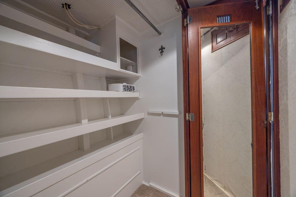 As we retrace our steps back across the galley, we realize that the stairs leading up to the lower saloon do indeed open. Below the lower saloon and accessible from the galley is a very large storage/ pump room complete with diamond plate, batteries in proper storage boxes, AC compressors, water heater, inverter room, and volumes of dry storage.