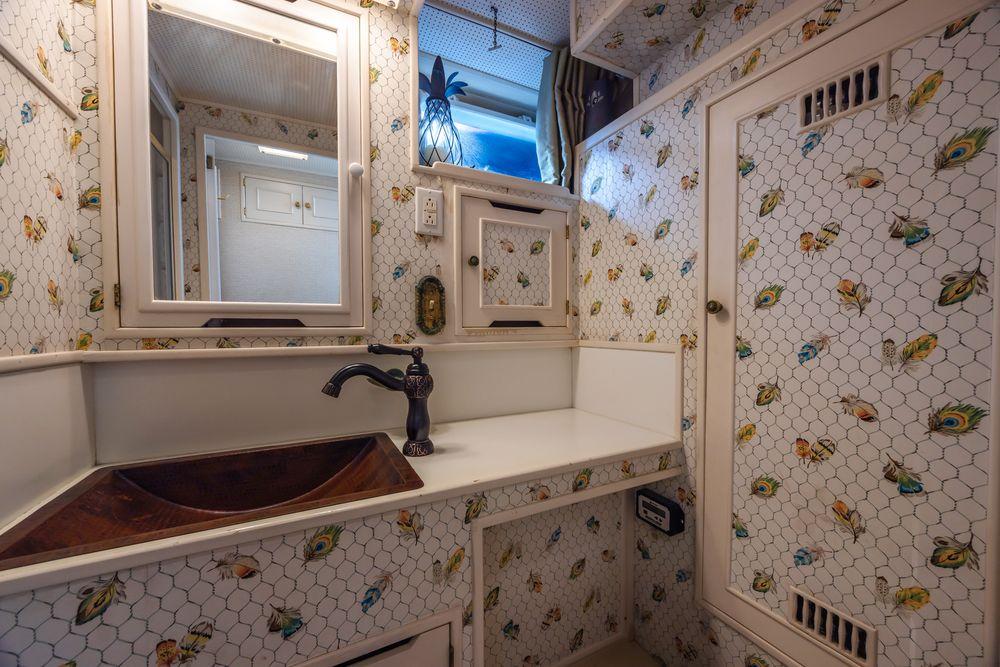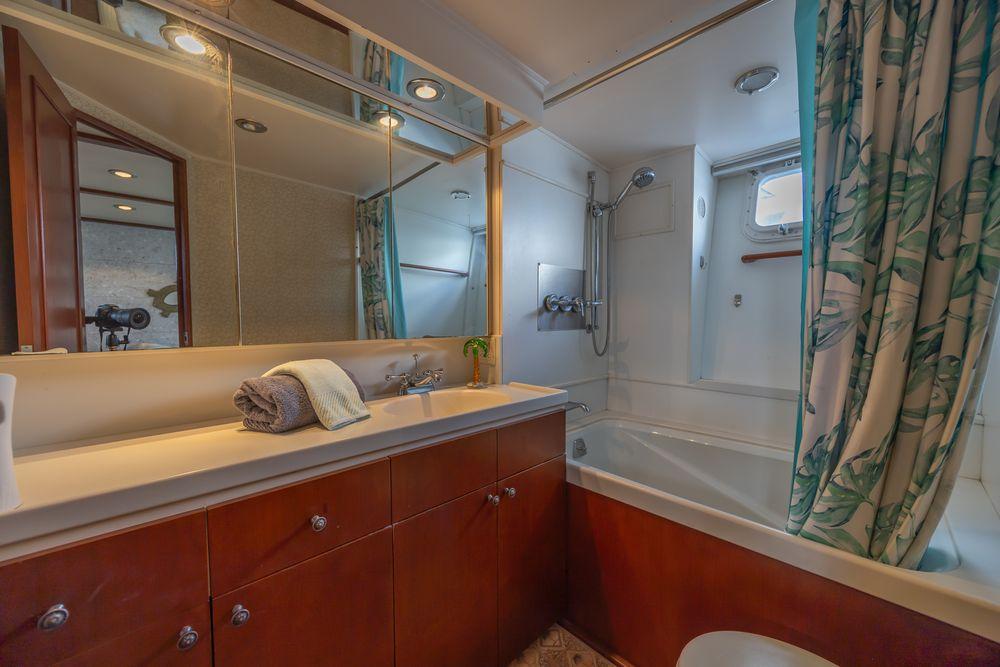 Proceeding aft, there is a walk-in hanging locker located to port and the master stateroom is directly aft with an oversized berth. There are opening port lights, an aft door exiting to the cockpit and lots of bright natural lighting. The ensuite head is amazing. Custom tropical tiles, 3 medicine cabinets and a deep tub/shower combo complement the custom wall coverings.