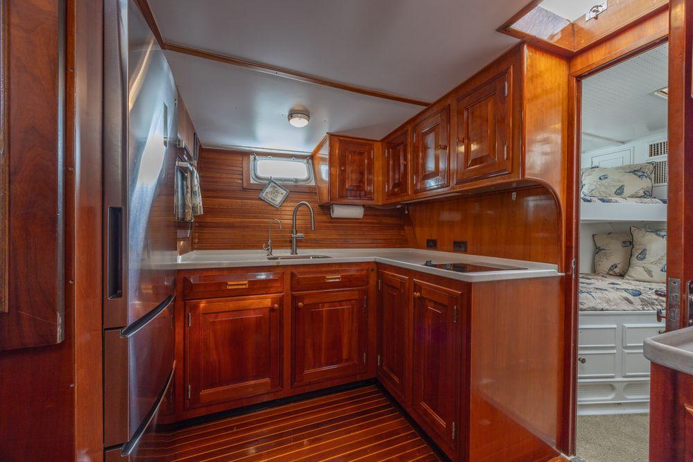 Proceeding forward and down 3 steps through a privacy door one enters the extremely well-appointed HINCKLEY galley. This galley spans the full beam of BREAKWAY. There are opening port lights and an overhead hatch. Vast Corian counter space (in excess of 20 sq. ft) combined with numerous raised paneled high gloss cherry cabinets are a sea going chef's delight. Teak and holly sole reflects the white overhead. Upgraded newer appliances just add such a major degree of usability to this galley.
