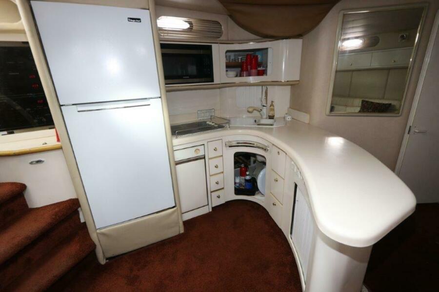 Sea Ray 630 Super Sun Sport Specifications - Standard Equipment Hull and Deck - 316 stainless steel deck rails - 316 stainless steel high-profile bow rail - 4-bolt stainless steel cleats (10) - Boot stripes - Bottom paint with epoxy primer - Fiberglass diamond plate flooring in bilge - Fiberglass swim platform with stainless steel ladder - Foam-filled under-floor areas - Gelcoat (Arctic white) - Gelcoated bilge area - High-performance vinylester resin - Insulated engine compartment - Integral swim platform - Meets applicable USCG and ABYC standards - Navigation lights - NMMA certification - PVC rub rail with stainless steel insert - Rod holders (2) - Stainless steel deck fill plates - Stainless steel deck runners - Stainless steel hull and deck portlights - Translucent deck hatch with locks and sky screen cover Windlass - Deck anchor hatch with freshwater washdown and hose - Lofrans Albatross (chain) with foot switches - Stainless steel anchor chute with stainless steel plow anchor Cockpit - Burl instrument panel - Circular cockpit seating with storage - Circular raised deluxe sunpad with headrest - Custom slide and swivel helm seat with flip-up thigh-rise bolster and companion bench seat - Fiberglass sport spoiler with stainless steel grab rails and overhead lighting - High-low fiberglass cockpit table - Indirect cockpit lighting - Molded deck access steps - Molded fiberglass entertainment center with wetbar and storage cabinet - Self-bailing fiberglass cockpit with bilge service hatches and stainless steel bilge ladder - Snap-in carpet liner - Snap-in cockpit carpet - Transom doors (2) - Two aft-facing wrap-around lounge seats with storage and access to fuel transfer valves - Wood-accent steering wheel - Clarion AM-FM digital cassette stereo with 6-disc CD changer, subwoofer, amplifier, 4 speakers and cockpit remote control - Icemaker - Refrigerator Forward Accessory Room - Flush cockpit hatches - 12 - 24V DC distribution panel - Battery switches - Water system components Crew Quarters - 12V Clarion AM-FM compact disc player with 2 speakers - 120V outlets - 24V - 120V lighting - 240V air conditioning and heating (7,000 BTU) - Beam system with hose and accessories - Full-length mirror - Head, shower, power vent and shower sump (24V) - Twin berths - Color TV - VCR - radio with antenna (120V - 60 cycle) or (220V - 50 cycle) Cabin - 120V outlets (GFI protected) - 24V - 120V directional lighting with dimmers - 24V indirect lighting with dimmer - Acrylic cabin door - Acrylic handrails - Corian countertops (Aurora or Sandstone) - Custom curtains - Deep-pile stain-resistant floor carpeting with padding - Floor storage - Interior Sunbrella carpet runners - Stacking washer and dryer (120V - 60 cycle) or (220V - 50 cycle) - Throw pillows Galley - 120V microwave - convection oven - 120V Sub Zero refrigerator and freezer with icemaker - 240V custom four-burner electric stove - Bar stools (2) - Breakfast bar - Custom Corian countertop with Corian sink and single-lever Grohe faucet - Galley storage drawers - Glass and dish storage racks - Power vent - Stainless steel stove rail - Wood floor - Galley convenience package (120V - 60 cycle) or (220V - 50 cycle) includes Spacemaker coffee maker and trash compactor Salon - Accent mirrors with indirect lighting - Built-in storage - High-low dining table - Leather sofa with electrically operated slide-out bed - Skylight - Throw pillows - Antenna and TV coaxial cable to dockside - Bose Lifestyle 20 Stereo with Jewel Cube Speakers (2) and LS Bass Module - Color television - Television cord with inlet - VCR with remote Master Stateroom - Cedar-lined hanging lockers with lights and mirrored doors (2) - Floor storage - Queen-size bed with inner-spring mattress, pillows, sheets and spread - Vanity with mirrors and built-in seating - Bose Acoustimass with 3 speakers and remote control - Color TV - VCR - radio combination with antenna Master Head - Acrylic accessories - Acrylic handrails - Cultured marble floor - Grohe faucet - Medicine cabinet with mirror - Molded vanity with porcelain sink, mirrors and storage below - Privacy door - Shower with seat, adjustable shower wand and bifold door - VacuFlush head Port Guest Stateroom - Cedar-lined hanging locker with light - Drawers under bunk - Portlights - TV - VCR combo - Upper and lower bunks with pillows, sheets and coordinated spread Port Guest Head - Acrylic accessories - Cultured marble floor - Full-length mirror - Grohe faucet - Medicine cabinet with mirror - Molded vanity with sink and storage - Privacy door - Shower with adjustable shower wand - VacuFlush head Windshield and Canvas - Aft sunshade - Stainless steel tri-section tinted glass windshield with electric front vent - Sunbrella Bimini top with vertical top storage - Windshield wipers with stainless steel washer system - Aft curtain - Canvas storage bag - Front curtains - Side curtains - Windshield shades Technical - 120V - 240V transient voltage surge protection - 120V - 20 amp - 12V converter - 120V - 40 amp - 240V - 24V converter (2) - 18 gallon 240V water heater - 24V air horn with accumulator tank - 24V automatic bilge pumps (2 aft, 1 forward) - 24V bilge lights - 24V electric bilge blowers (4) Delta T - 24V high water bilge alarms and pumps (1 aft, 1 bilge and 1 forward) - 24V power vents (3) - heads and galley - 24V shower - condensate sump pump - Dockside power with 50-foot cords - 240V pressure water system with 24V ShurFlo pump (back-up) - 50 amp - 12V electronics circuit with large ground plate - 70 gallon fiberglass holding tank with macerator pump-out - 8D batteries (4) for generator - Aeroquipt A-1 fuel lines - Backlit switch panel with weatherproof rocker switches, switchable circuit, remote circuit breaker panels and variable dimmer control - Bilge freshwater hose and spigot - Color-coded wiring with chafe protection - Compass (large) - Digital LCD systems monitor for engine diagnostics and pump monitoring - Dual hydraulic gear shift and 