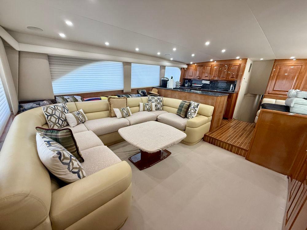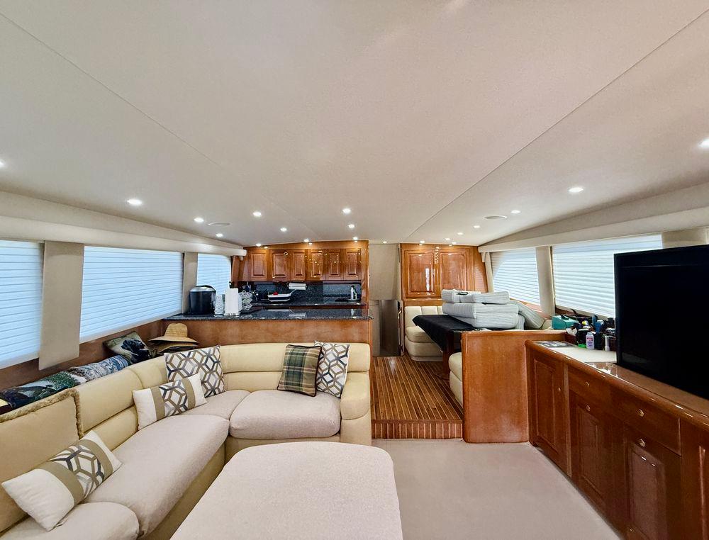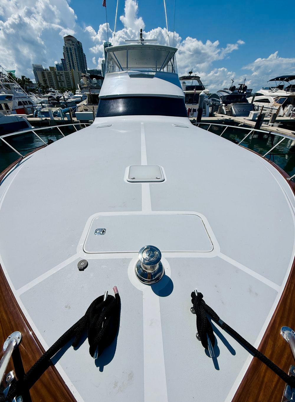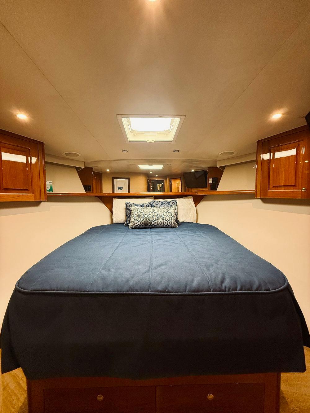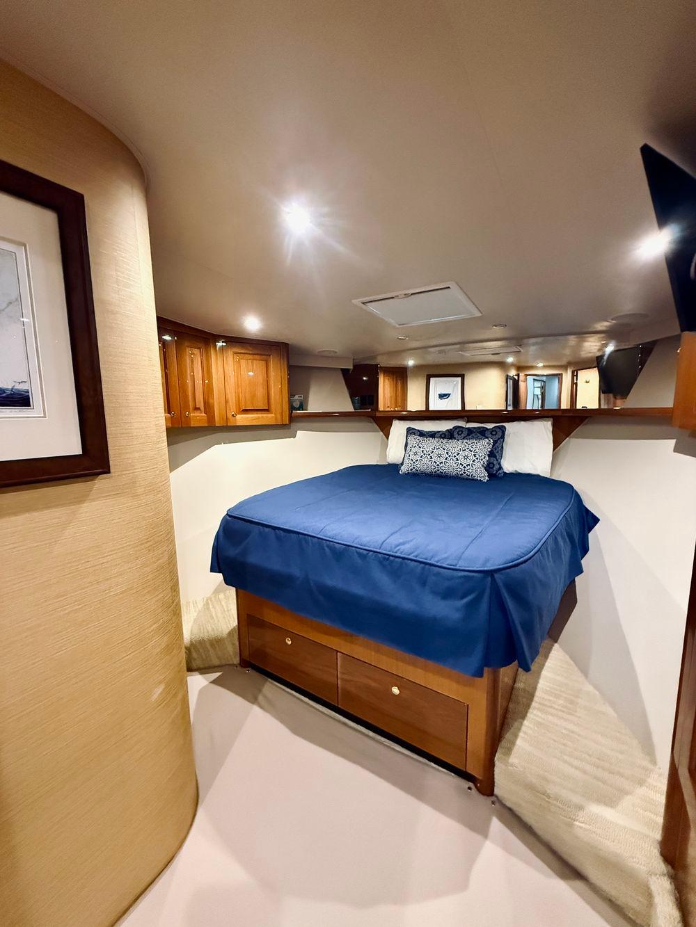 Stepping aboard she displays a 179 square foot cockpit that includes Mezzanine seating with easy engine room access, ample storage, plenty of refrigeration/freezer space. A beautiful fighting chair sits center for its next catch. There are glendenning cable master stations on both starboard and port sides of the cockpit. The teak decks and cover boards have been replaced and all the varnish on the boat is in excellent condition. A custom painted Whisper Gray ladder leads to the flybridge where you will find updated Garmin electronics, a new Makrolon enclosure, and upgraded refrigeration/freezer chest forward of the console.